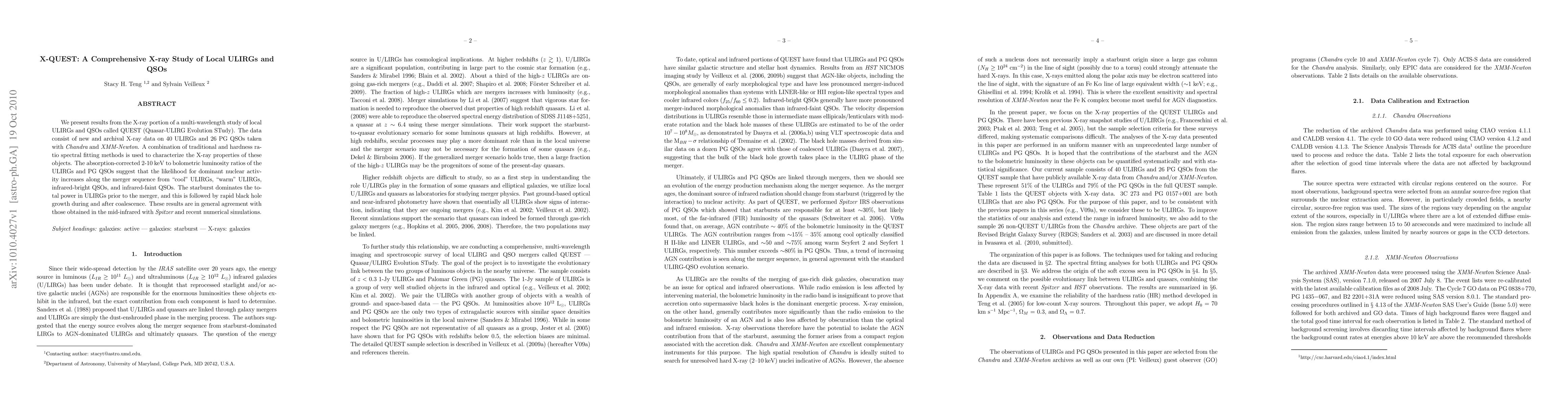 We present results from the X-ray portion of a multi-wavelength study of local ULIRGs and QSOs called QUEST (Quasar-ULIRG Evolution STudy). The data consist of new and archival X-ray data on 40 ULIRGs and 26 PG QSOs taken with Chandra and XMM-Newton. A combination of traditional and hardness ratio spectral fitting methods is used to characterize the X-ray properties of these objects. The absorption-corrected 2-10 keV to bolometric luminosity ratios of the ULIRGs and PG QSOs suggest that the likelihood for dominant nuclear activity increases along the merger sequence from "cool" ULIRGs, "warm" ULIRGs, infrared-bright QSOs, and infrared-faint QSOs. The starburst dominates the total power in ULIRGs prior to the merger, and this is followed by rapid black hole growth during and after coalescence. These results are in general agreement with those obtained in the mid-infrared with Spitzer and recent numerical simulations.