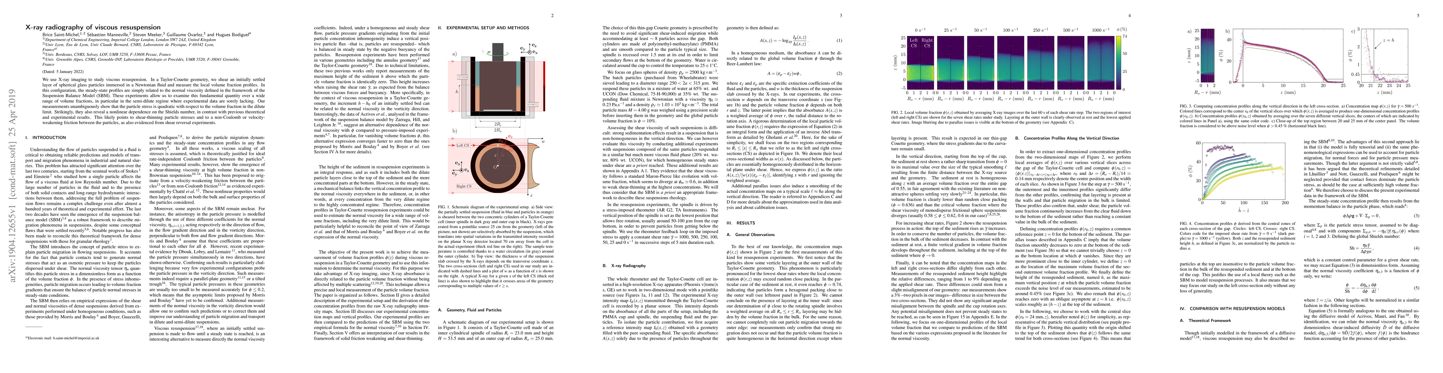 This research uses X-ray imaging to study how particles resuspend in a fluid under shear stress in a Taylor-Couette setup. The study finds that particle stress increases quadratically with volume fraction in dilute solutions, contradicting previous assumptions, and suggests shear-thinning particle stresses and non-Coulomb friction between particles.