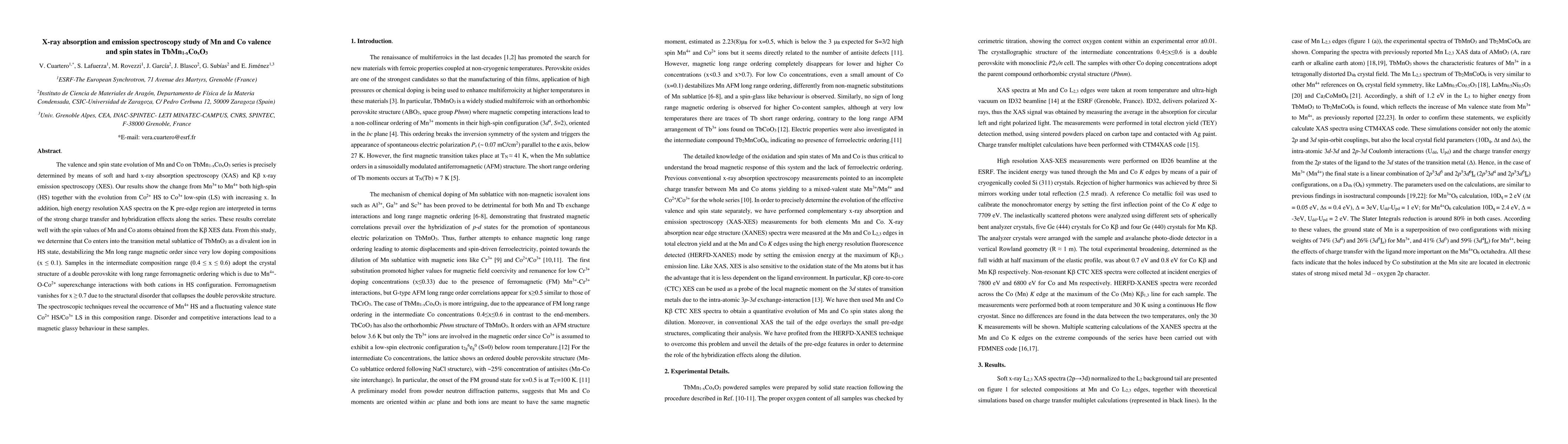 The valence and spin state evolution of Mn and Co on TbMn$_{\rm 1-x}$Co$_{\rm x}$O$_3$ series is precisely determined by means of soft and hard x-ray absorption spectroscopy (XAS) and K$\beta$ x-ray emission spectroscopy (XES). Our results show the change from Mn$^{3+}$ to Mn$^{4+}$ both high-spin (HS) together with the evolution from Co$^{2+}$ HS to Co$^{3+}$ low-spin (LS) with increasing $\rm x$. In addition, high energy resolution XAS spectra on the K pre-edge region are interpreted in terms of the strong charge transfer and hybridization effects along the series. These results correlate well with the spin values of Mn and Co atoms obtained from the K$\beta$ XES data. From this study, we determine that Co enters into the transition metal sublattice of TbMnO$_3$ as a divalent ion in HS state, destabilizing the Mn long range magnetic order since very low doping compositions (${\rm x} \le 0.1$). Samples in the intermediate composition range ($0.4 \le {\rm x} \le 0.6$) adopt the crystal structure of a double perovskite with long range ferromagnetic ordering which is due to Mn$^{4+}$-O-Co$^{2+}$ superexchange interactions with both cations in HS configuration. Ferromagnetism vanishes for ${\rm x} \ge 0.7$ due to the structural disorder that collapses the double perovskite structure. The spectroscopic techniques reveal the occurrence of Mn$^{4+}$ HS and a fluctuating valence state Co$^{2+}$ HS/Co$^{3+}$ LS in this composition range. Disorder and competitive interactions lead to a magnetic glassy behaviour in these samples.