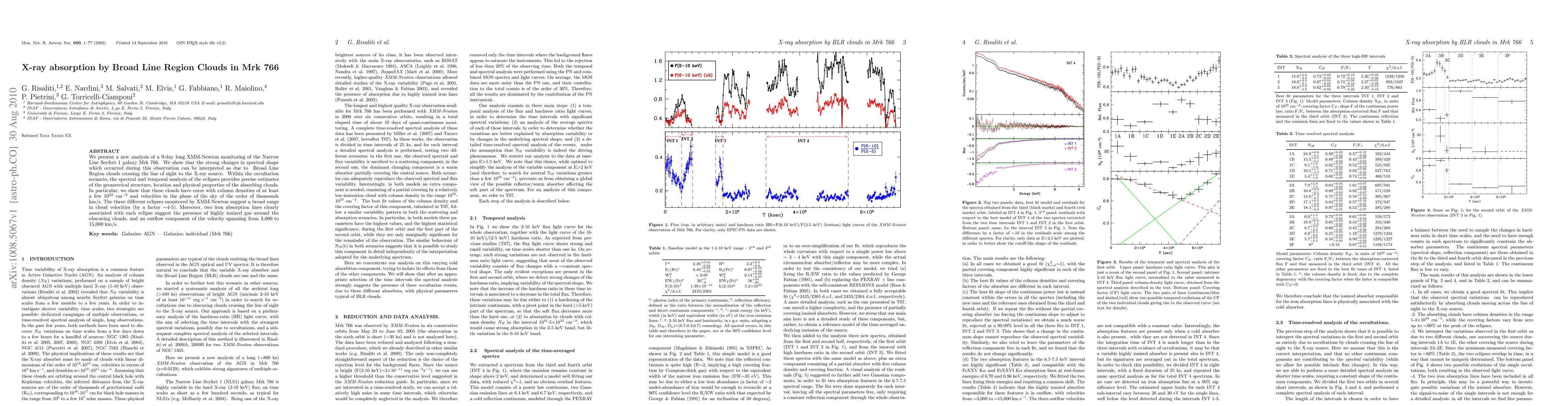 We present a new analysis of a 9-day long XMM-Newton monitoring of the Narrow Line Seyfert 1 galaxy Mrk 766. We show that the strong changes in spectral shape which occurred during this observation can be interpreted as due to Broad Line Region clouds crossing the line of sight to the X-ray source. Within the occultation scenario, the spectral and temporal analysis of the eclipses provides precise estimates of the geometrical structure, location and physical properties of the absorbing clouds. In particular, we show that these clouds have cores with column densities of at least a few 10^23 cm^-2 and velocities in the plane of the sky of the order of thousands km/s. The three different eclipses monitored by XMM-Newton suggest a broad range in cloud velocities (by a factor ~4-5). Moreover, two iron absorption lines clearly associated with each eclipse suggest the presence of highly ionized gas around the obscuring clouds, and an outflow component of the velocity spanning from 3,000 to 15,000 km/s