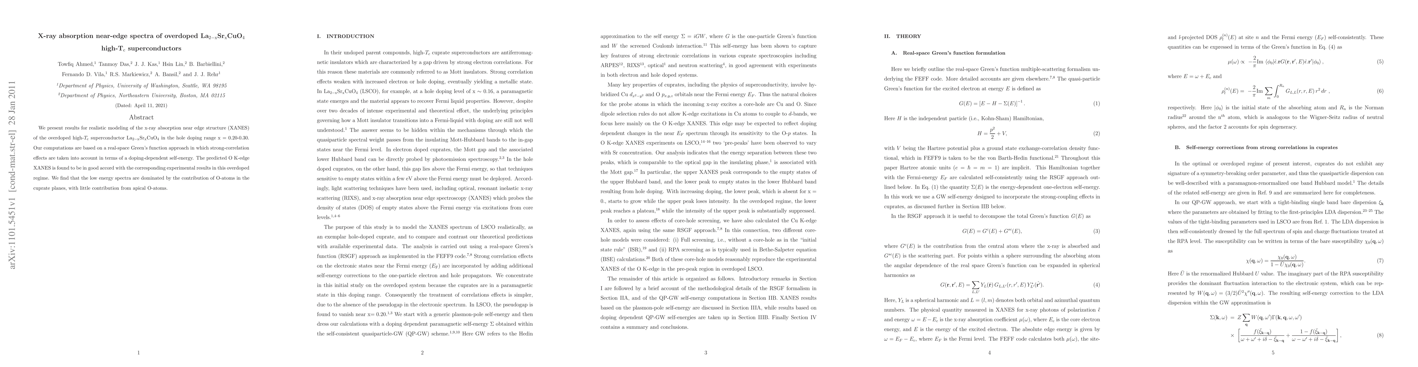 This study models the X-ray absorption near edge structure (XANES) of overdoped La_2-xSr_xCuO_4 high-T_c superconductors using a real-space Green's function approach, revealing strong-correlation effects and a good match with experimental data. The low-energy XANES spectra are primarily influenced by O-atoms in the cuprate planes, with minimal contribution from apical O-atoms.