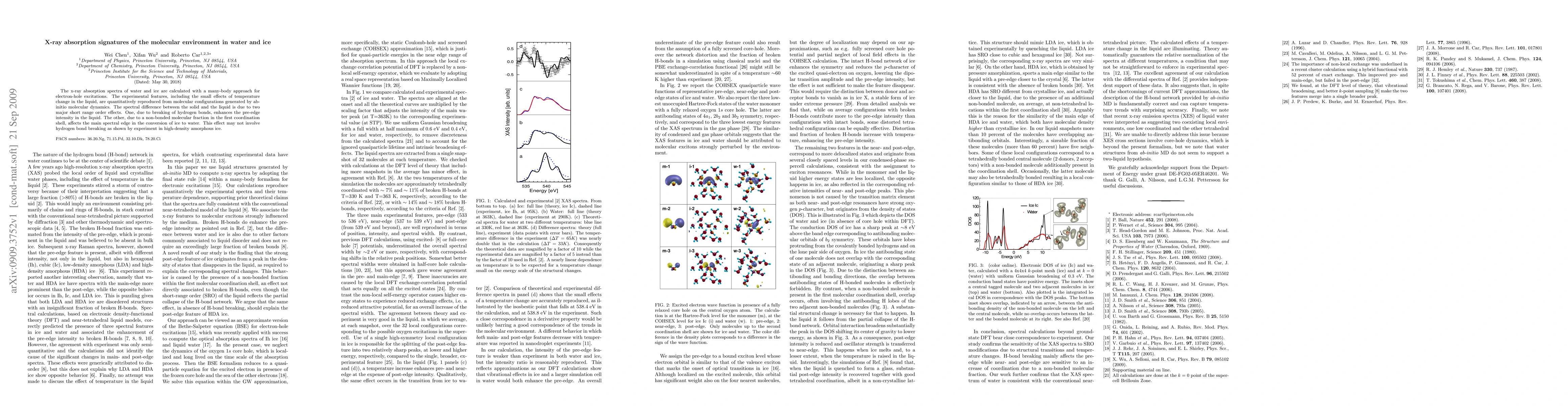 This study uses a many-body approach to calculate x-ray absorption spectra of water and ice, accurately reproducing experimental features. The spectral difference between liquid and solid states is attributed to hydrogen bond breaking and a non-bonded molecular fraction in the first coordination shell, with the latter effect observed even in high-density amorphous ice.