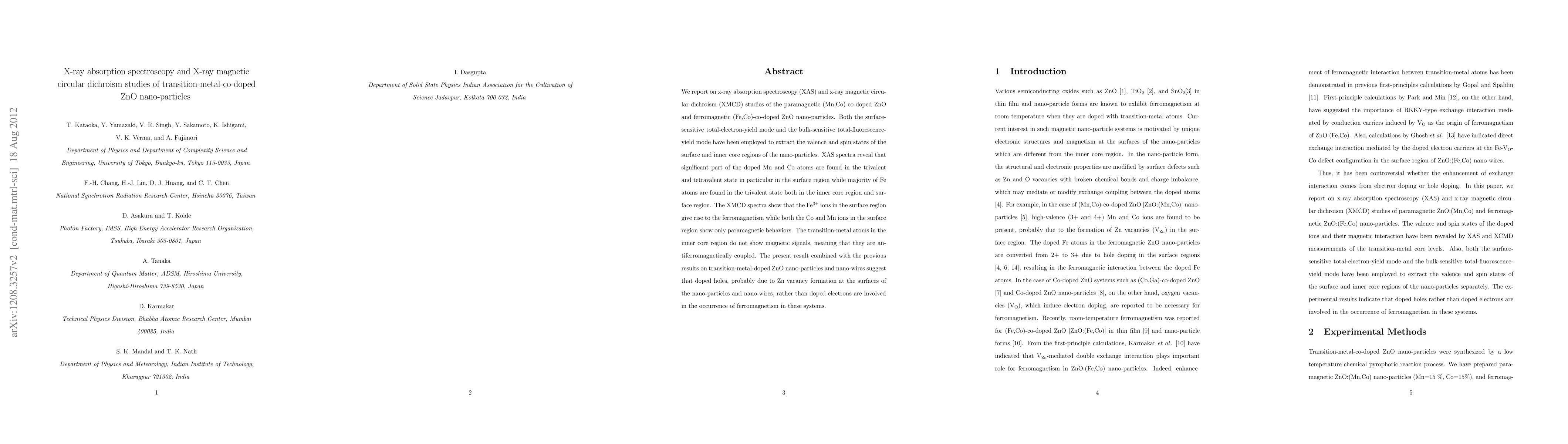 This paper uses X-ray absorption spectroscopy (XAS) and X-ray magnetic circular dichroism (XMCD) to study the valence and spin states of transition-metal-co-doped ZnO nanoparticles. The results indicate that Mn and Co atoms are mostly trivalent/tetravalent on the surface, while Fe atoms are predominantly trivalent throughout, and that surface Fe ions induce ferromagnetism, while surface Mn and Co ions exhibit paramagnetism.