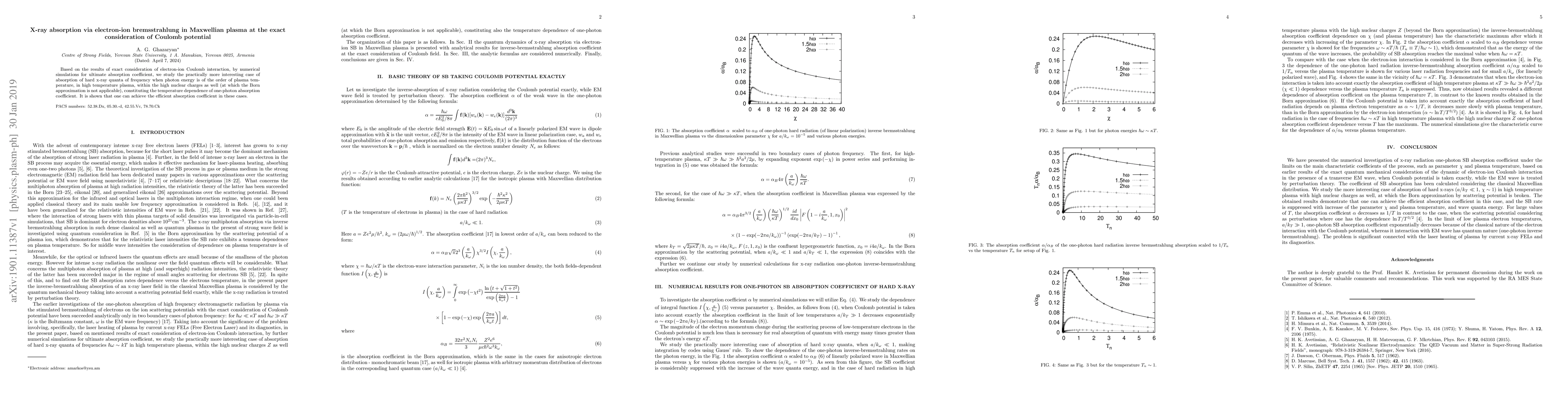 Based on the results of exact consideration of electron-ion Coulomb interaction, by numerical simulations for ultimate absorption coefficient, we study the practically more interesting case of absorption of hard x-ray quanta of frequency when photon energy is of the order of plasma temperature, in high temperature plasma, within the high nuclear charges as well (at which the Born approximation is not applicable), constituting the temperature dependence of one-photon absorption coefficient. It is shown that one can achieve the efficient absorption coefficient in these cases.