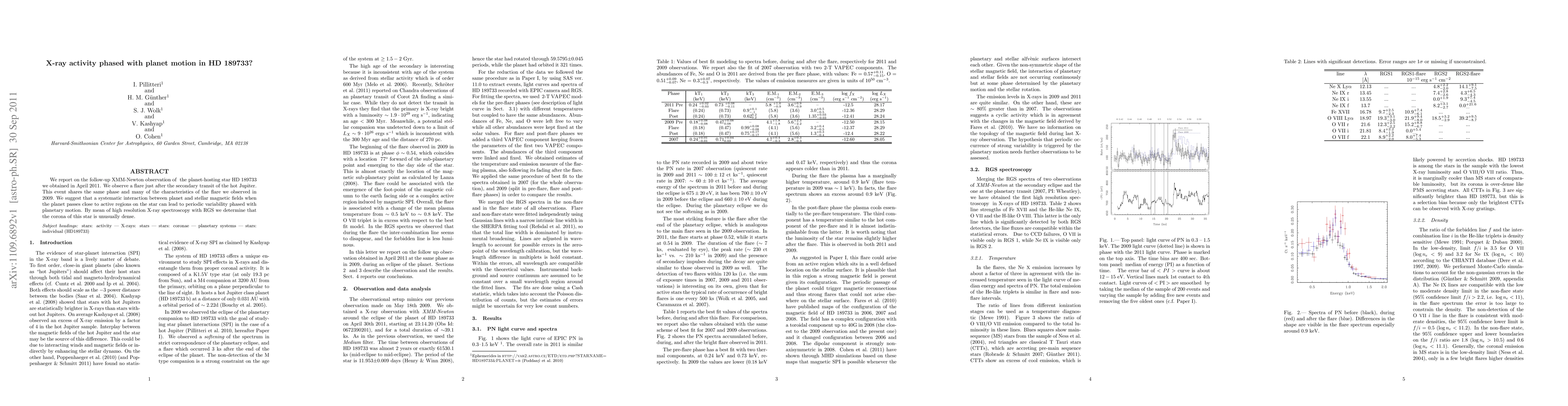 We report on the follow-up XMM-Newton observation of the planet-hosting star HD 189733 we obtained in April 2011. We observe a flare just after the secondary transit of the hot Jupiter. This event shares the same phase and many of the characteristics of the flare we observed in 2009. We suggest that a systematic interaction between planet and stellar magnetic fields when the planet passes close to active regions on the star can lead to periodic variability phased with planetary motion. By mean of high resolution X-ray spectroscopy with RGS we determine that the corona of this star is unusually dense.