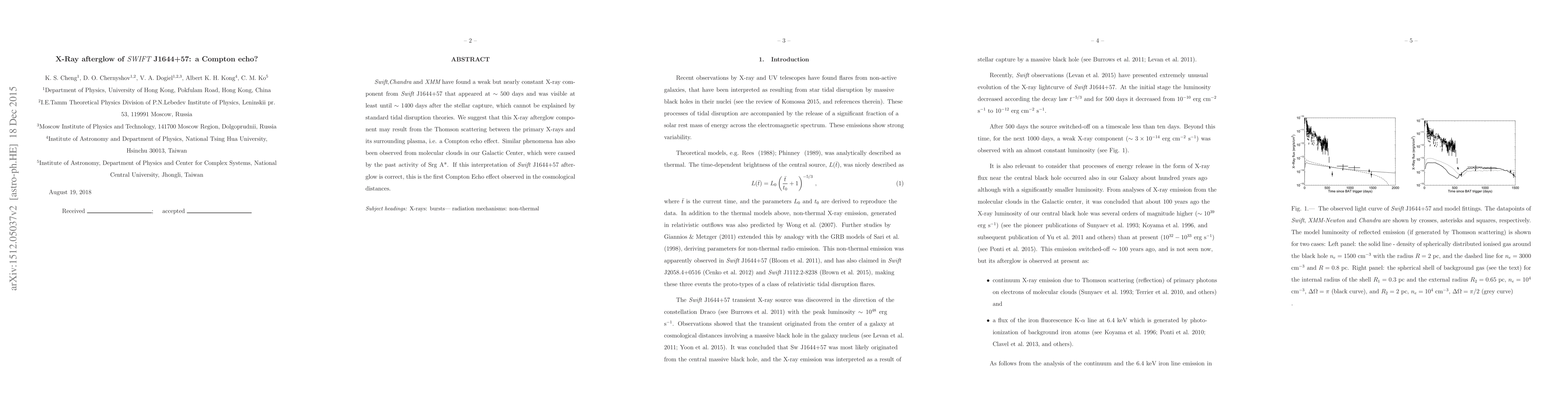 This paper investigates a persistent X-ray afterglow from Swift J1644+57, appearing 500 days post-disruption and lasting at least 1400 days, which challenges standard tidal disruption models. The authors propose that this afterglow may result from a Compton echo effect, where Thomson scattering of primary X-rays by surrounding plasma explains the observed component.
