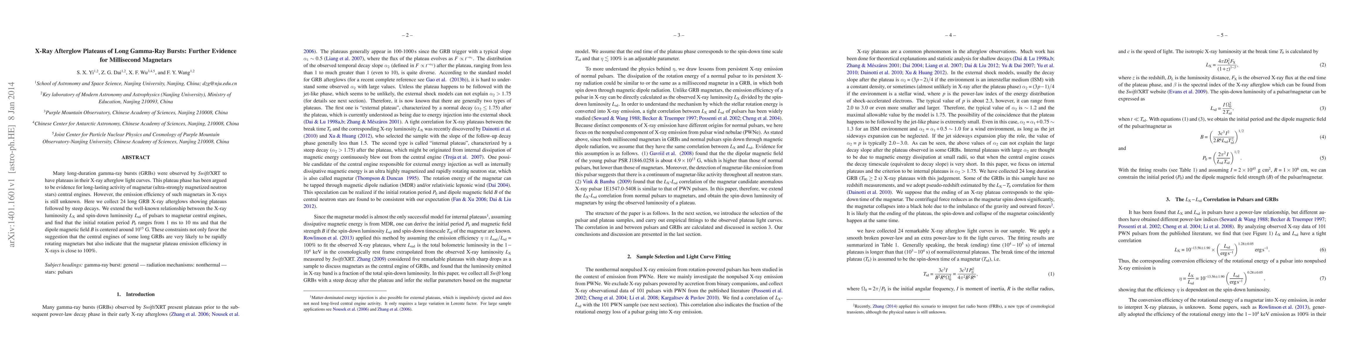 This paper analyzes X-ray afterglow plateaus in long gamma-ray bursts, finding evidence supporting millisecond magnetars as their central engines. The study suggests that the plateau emission efficiency in X-rays is nearly 100%, indicating magnetars with initial rotation periods between 1 ms and 10 ms and magnetic fields around $10^{15}$ G.