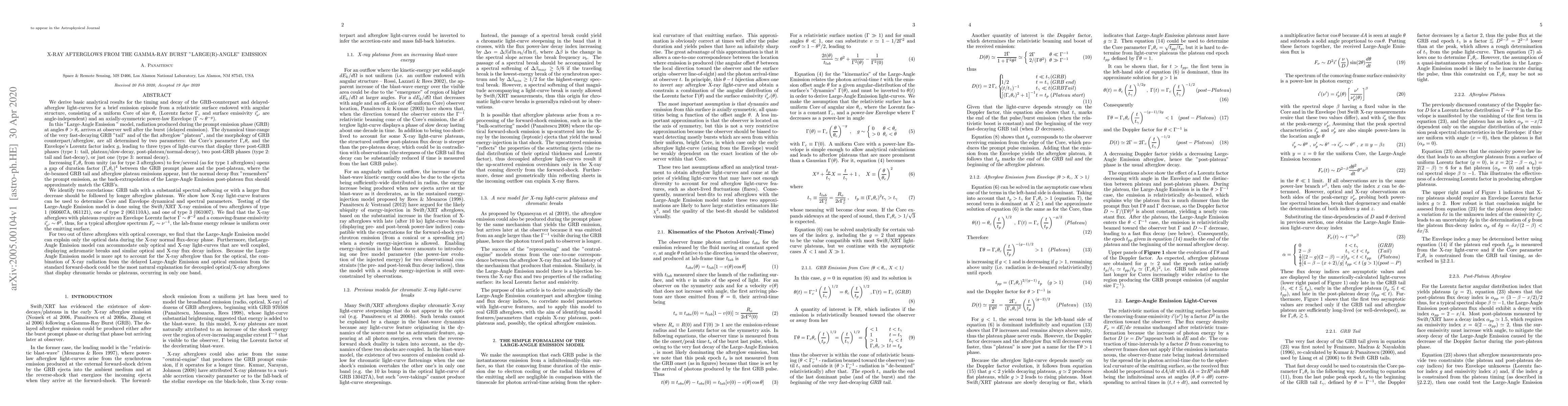 We derive basic analytical results for the timing and decay of the GRB-counterpart and delayed-afterglow light-curves for a brief emission episode from a relativistic surface endowed with angular structure, consisting of a uniform Core of size theta_c (Lorentz factor Gamma_c and surface emissivity i_nu are angle-independent) and an axially-symmetric power-law Envelope (Gamma ~ theta^{-g}). In this Large-Angle Emission (LAE) model, radiation produced during the prompt emission phase (GRB) at angles theta > theta_c arrives at observer well after the burst (delayed emission). The dynamical time-range of the very fast-decaying GRB "tail" and of the flat afterglow "plateau", and the morphology of GRB counterpart/afterglow, are all determined by two parameters: the Core's parameter Gamma_c*theta_c and the Envelope's Lorentz factor index g, leading to three types of light-curves that display three post-GRB phases (type 1: tail, plateau/slow-decay, post-plateau/normal-decay), two post-GRB phases (type 2: tail and fast-decay), or just one (type 3: normal decay). We show how X-ray light-curve features can be used to determine Core and Envelope dynamical and spectral parameters. Testing of the LAE model is done using the Swift/XRT X-ray emission of two afterglows of type 1 (060607A, 061121), one of type 2 (061110A), and one of type 3 (061007). We find that the X-ray afterglows with plateaus require an Envelope Lorentz factor Gamma ~ theta^{-2} and a comoving-frame emissivity i_nu ~ theta^2, thus, for a typical afterglow spectrum F_nu ~ nu^{-1}, the lab-frame energy release is uniform over the emitting surface.