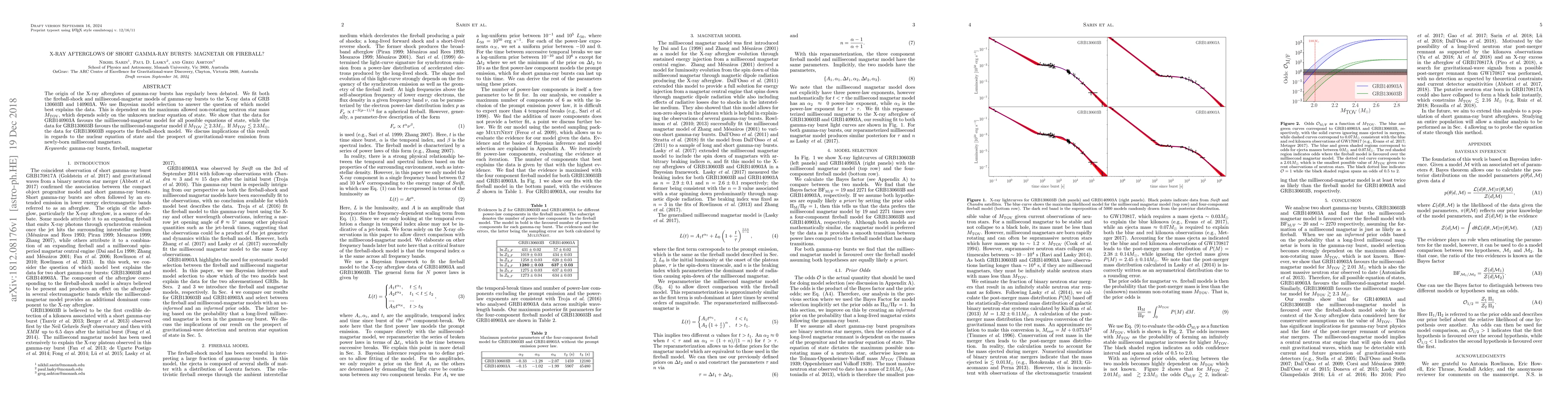 The origin of the X-ray afterglows of gamma-ray bursts has regularly been debated. We fit both the fireball-shock and millisecond-magnetar models of gamma-ray bursts to the X-ray data of GRB 130603B and 140903A. We use Bayesian model selection to answer the question of which model best explains the data. This is dependent on the maximum allowed non-rotating neutron star mass $M_{\textrm{TOV}}$, which depends solely on the unknown nuclear equation of state. We show that the data for GRB140903A favours the millisecond-magnetar model for all possible equations of state, while the data for GRB130603B favours the millisecond-magnetar model if $M_{\textrm{TOV}} \gtrsim 2.3 M_{\odot}$. If $M_{\textrm{TOV}} \lesssim 2.3 M_{\odot}$, the data for GRB130603B supports the fireball-shock model. We discuss implications of this result in regards to the nuclear equation of state and the prospect of gravitational-wave emission from newly-born millisecond magnetars.