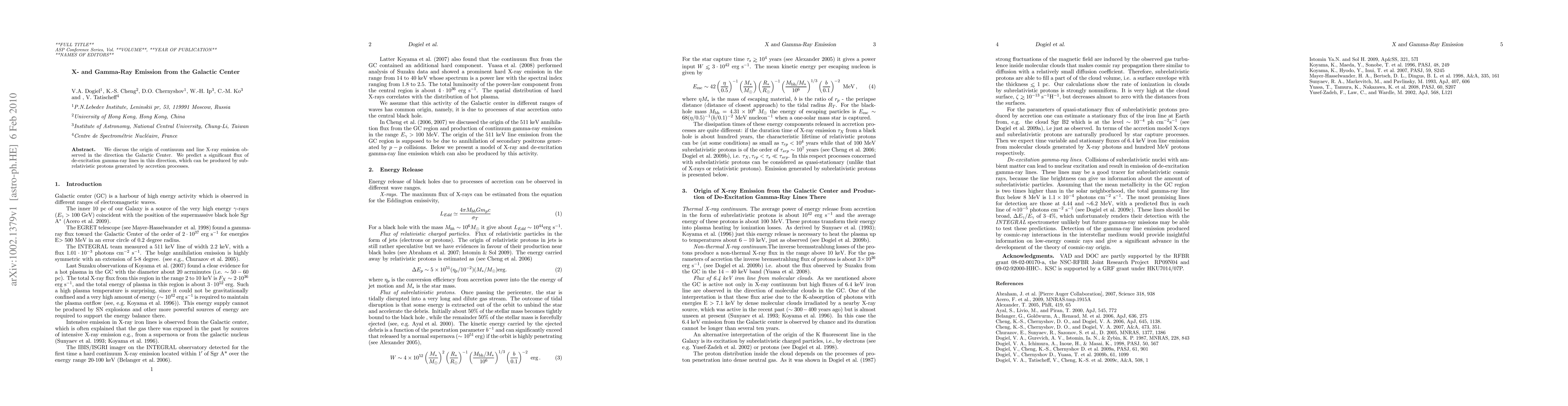 We discuss the origin of continuum and line X-ray emission observed in the direction the Galactic Center. We predict a significant flux of de-excitation gamma-ray lines in this direction, which can be produced by subrelativistic protons generated by accretion processes.