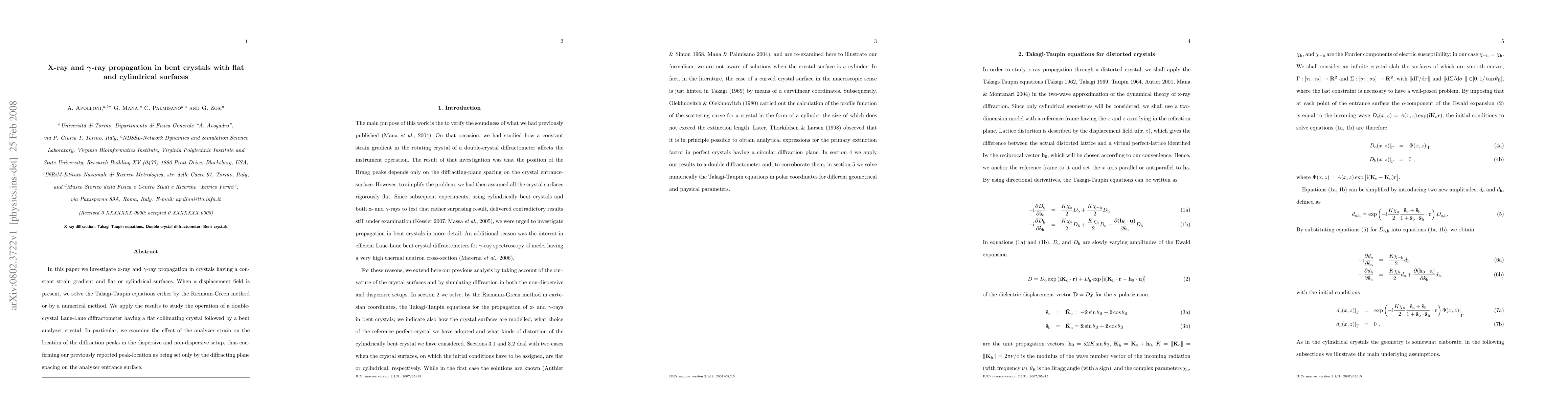 This paper examines x-ray and $\gamma$-ray propagation in strained crystals with flat or cylindrical surfaces, solving the Takagi-Taupin equations to analyze a double-crystal Laue-Laue diffractometer. It confirms that diffraction peak location is determined by the diffracting plane spacing on the analyzer entrance surface, regardless of the analyzer strain.