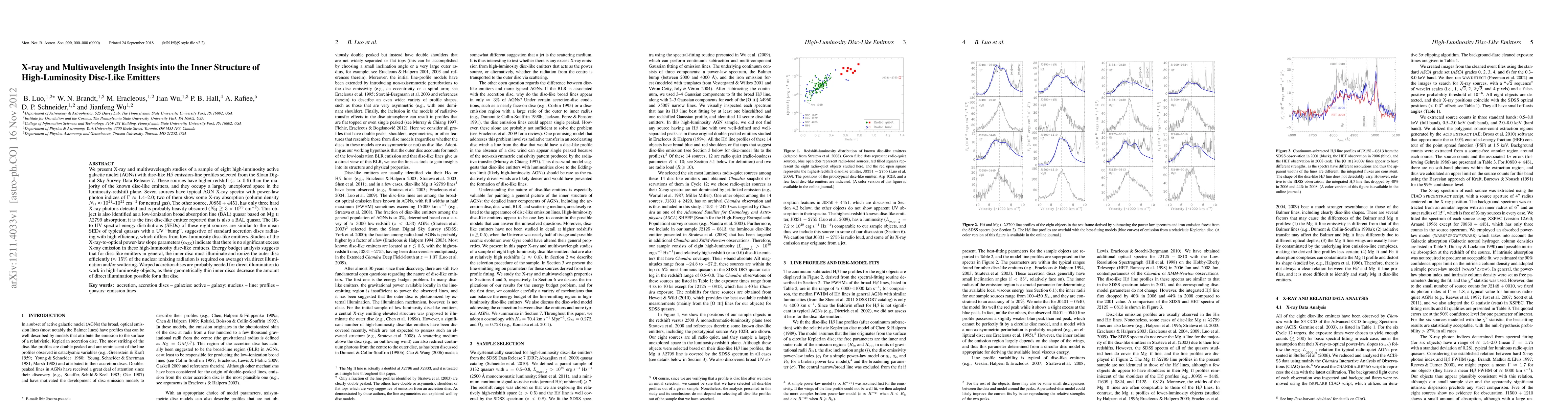 We present X-ray and multiwavelength studies of a sample of eight high-luminosity active galactic nuclei (AGNs) with disc-like H\beta emission-line profiles selected from the Sloan Digital Sky Survey Data Release 7. These sources have higher redshift (z~0.6) than the majority of the known disc-like emitters, and they occupy a largely unexplored space in the luminosity-redshift plane. Seven sources have typical AGN X-ray spectra with power-law photon indices of \Gamma~1.4-2.0; two of them show some X-ray absorption (column density N_H~10^{21}-10^{22} cm^{-2}$ for neutral gas). The other source, J0850+4451, has only three hard X-ray photons detected and is probably heavily obscured (N_H>3x10^{23} cm^{-2}). This object is also identified as a low-ionization broad absorption line (BAL) quasar based on Mg II \lambda2799 absorption; it is the first disc-like emitter reported that is also a BAL quasar. The IR-to-UV spectral energy distributions (SEDs) of these eight sources are similar to the mean SEDs of typical quasars with a UV "bump", suggestive of standard accretion discs radiating with high efficiency, which differs from low-luminosity disc-like emitters. Studies of the X-ray-to-optical power-law slope parameters (\alpha_{OX}) indicate that there is no significant excess X-ray emission in these high-luminosity disc-like emitters. Energy budget analysis suggests that for disc-like emitters in general, the inner disc must illuminate and ionize the outer disc efficiently (~15% of the nuclear ionizing radiation is required on average) via direct illumination and/or scattering. Warped accretion discs are probably needed for direct illumination to work in high-luminosity objects, as their geometrically thin inner discs decrease the amount of direct illumination possible for a flat disc.