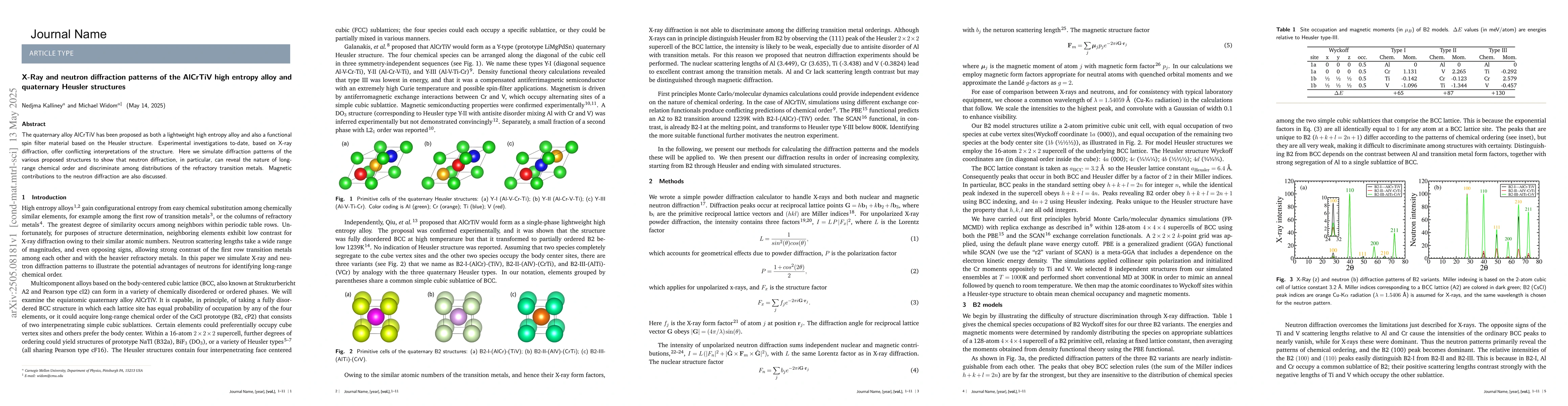 The research employs simulations of X-ray and neutron diffraction patterns for the AlCrTiV high entropy alloy and quaternary Heusler structures to resolve conflicting interpretations from previous X-ray diffraction studies.
