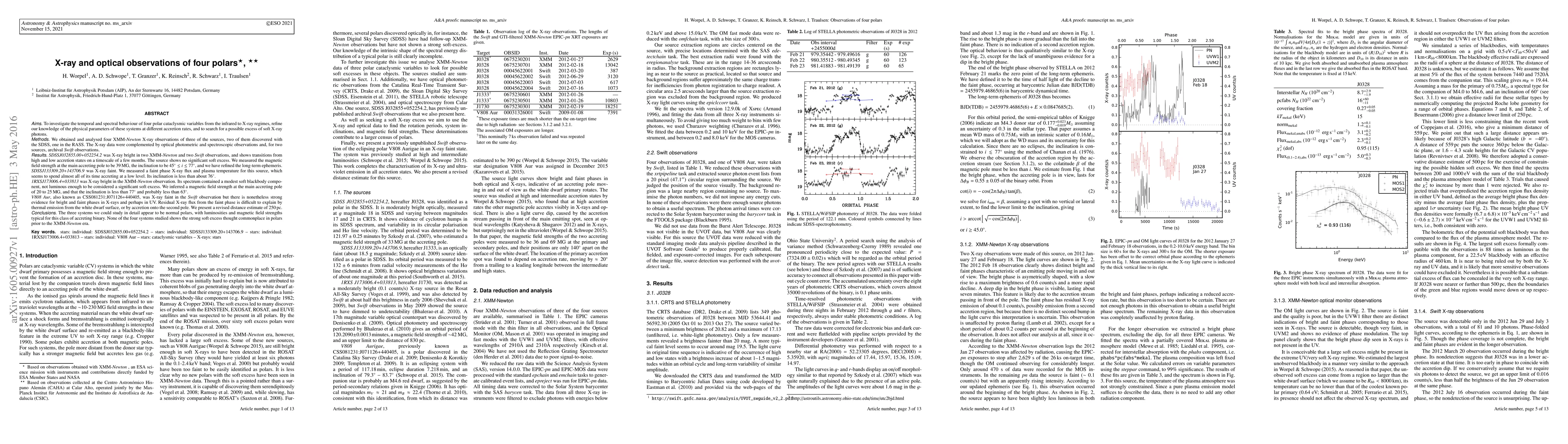 We aim to study the temporal and spectral behaviour of four polar CVs from the infrared to X-ray regimes, refine our knowledge of the physical parameters of these systems at different accretion rates, and to search for a possible excess of soft X-ray photons. We analysed four XMM X-ray observations of three of the sources, two of them discovered in SDSS, one in RASS. The X-ray data were complemented by optical photometry and spectroscopy and, for two sources, archival Swift observations. SDSSJ0328 was X-ray bright in two XMM and two Swift observations, and shows transitions from high and low accretion states over a few months. It has no strong soft excess. We measured the magnetic field strength at the main pole to be 39 MG, the inclination to be 45