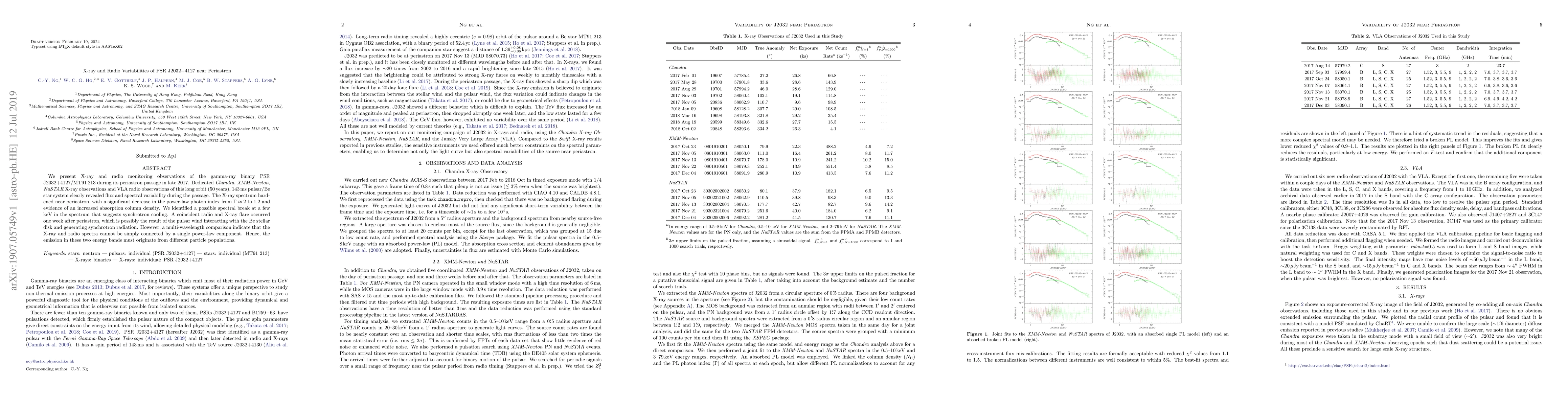 This paper reports X-ray and radio variability in the gamma-ray binary PSR J2032+4127 near periastron, showing spectral hardening and a significant decrease in the X-ray photon index, alongside a radio flare likely due to pulsar wind interaction with the Be star disk. The distinct X-ray and radio emissions suggest different particle populations.