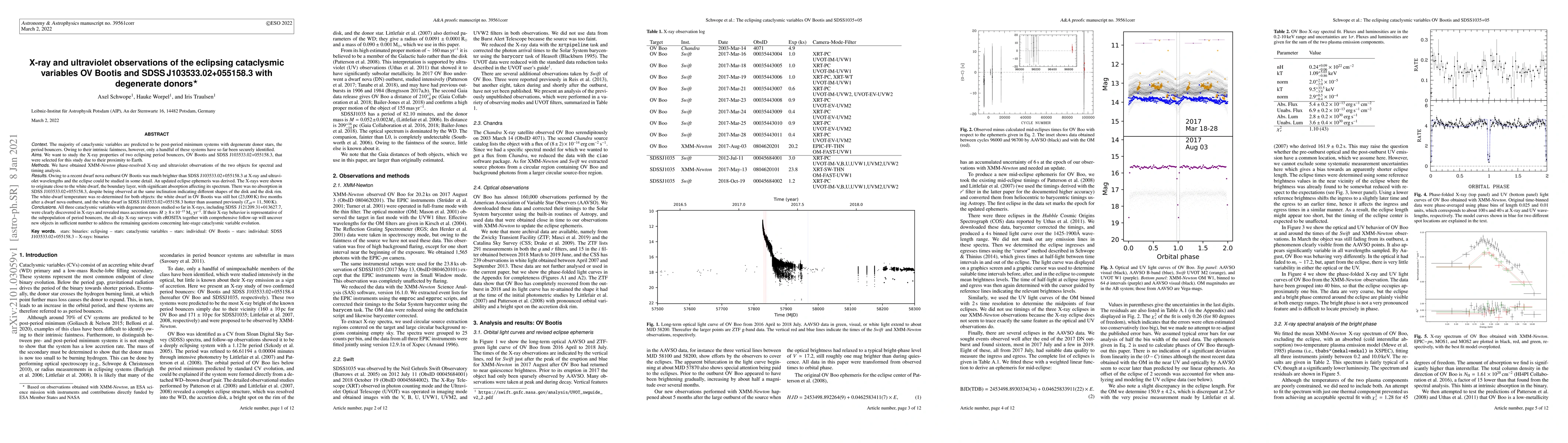 The majority of cataclysmic variables are predicted to be post-period minimum systems with degenerate donor stars, the period bouncers. Owing to their intrinsic faintness, however, only a handful of these systems have so far been securely identified. We want to study the X-ray properties of two eclipsing period bouncers, OV Bootis and SDSS J103533.02+055158.3, that were selected for this study due to their proximity to Earth. We have obtained XMM-Newton phase-resolved X-ray and ultraviolet observations of the two objects for spectral and timing analysis. Owing to a recent dwarf nova outburst OV Boo was much brighter than SDSS J103533.02+055158.3 at X-ray and ultraviolet wavelengths and the eclipse could be studied in some detail. An updated eclipse ephemeris was derived. The X-rays were shown to originate close to the white dwarf, the boundary layer, with significant absorption affecting its spectrum. There was no absorption in SDSS J103533.02+055158.3, despite being observed at the same inclination indicating different shapes of the disk and the disk rim. The white-dwarf temperature was re-determined for both objects: the white dwarf in OV Boo was still hot (23,000 K) five months after a dwarf nova outburst, and the white dwarf in SDSS J103533.02+055158.3 hotter than assumed previously (Teff = 11,500 K). All three cataclysmic variables with degenerate donors studied so far in X-rays, including SDSS J121209.31+013627.7, were clearly discovered in X-rays and revealed mass accretion rates dot(M) >= 8 x 10^(-15) Msun/ yr. If their X-ray behavior is representative of the subpopulation of period bouncers, the all-sky X-ray surveys with eROSITA together with comprehensive follow-up will uncover new objects in sufficient number to address the remaining questions concerning late-stage cataclysmic variable evolution.