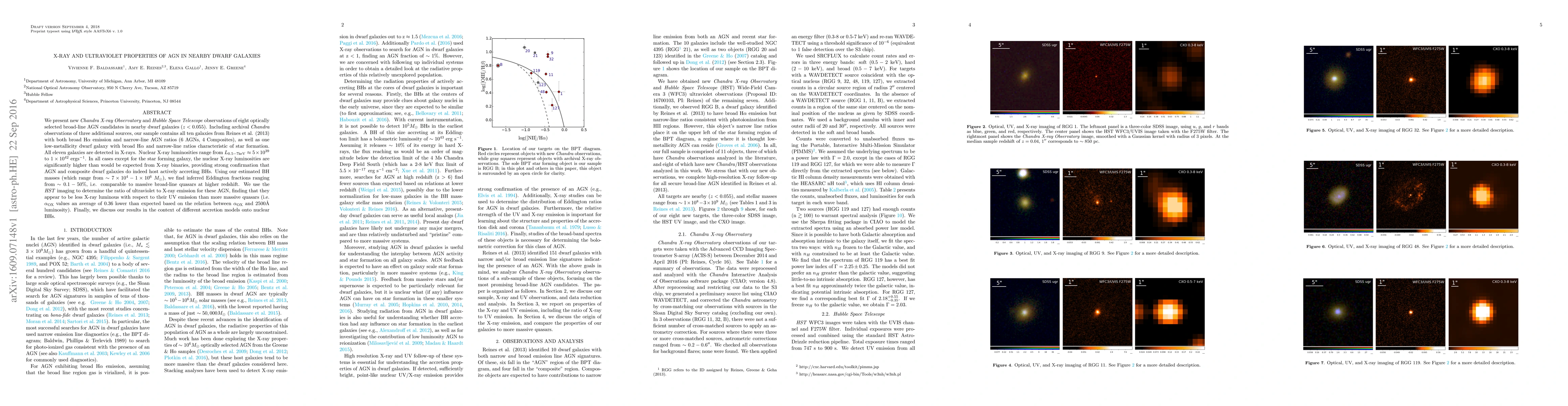 This study uses Chandra X-ray and Hubble Space Telescope observations to investigate the X-ray and ultraviolet properties of active galactic nuclei (AGN) in nearby dwarf galaxies. The findings confirm that these AGN host actively accreting black holes, with inferred Eddington fractions comparable to those in more massive quasars.