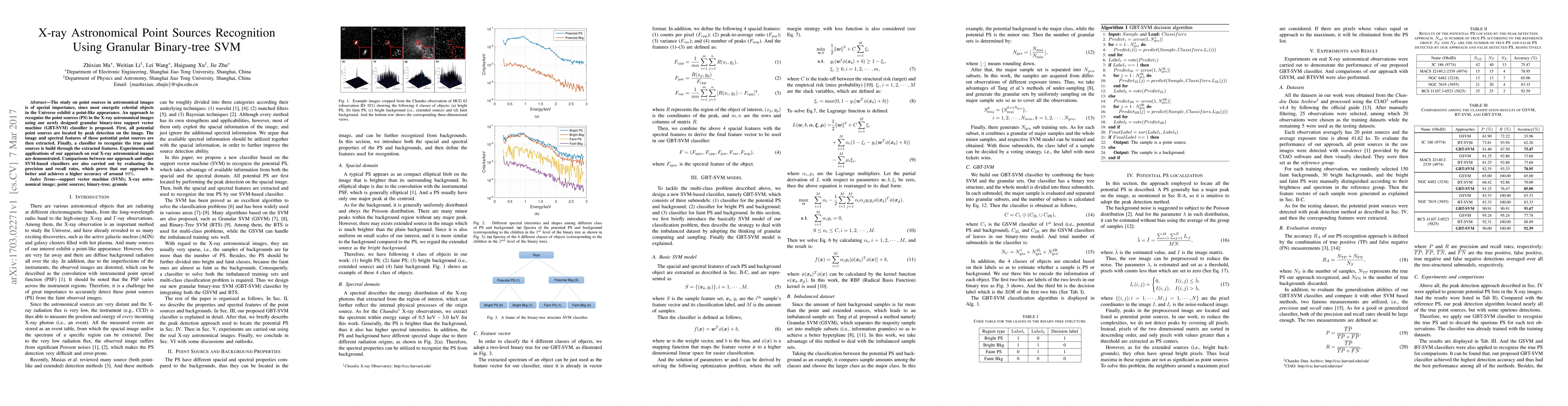 This paper proposes a novel granular binary-tree support vector machine (GBT-SVM) classifier for recognizing point sources in X-ray astronomical images. The method involves peak detection, feature extraction, and classification, achieving superior accuracy of approximately 89% compared to other SVM-based classifiers.