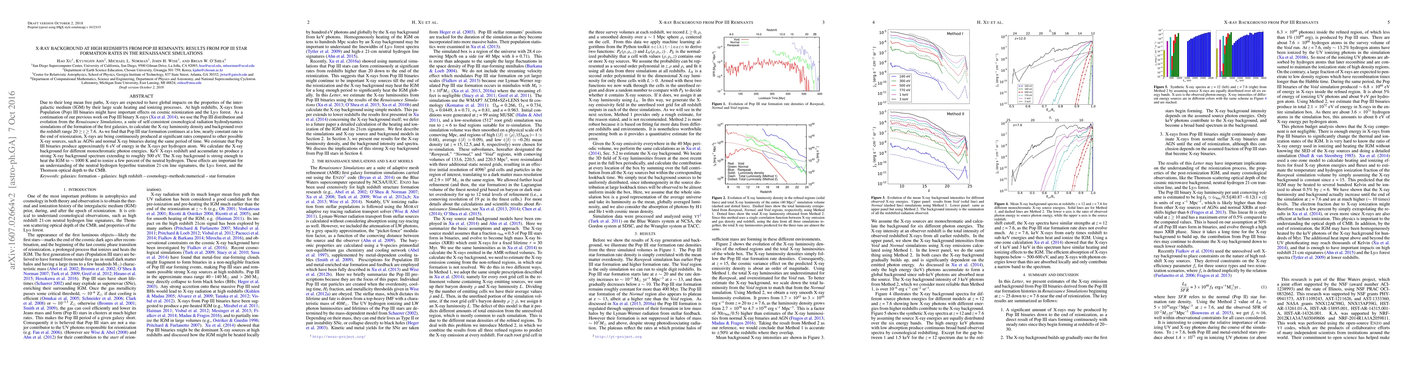 This paper investigates the X-ray background from Population III star remnants at high redshifts using the Renaissance Simulations. It finds that Pop III binaries continuously produce significant X-ray energy, contributing to heating and ionization of the intergalactic medium, which impacts the 21-cm line signatures, Lyman alpha forest, and CMB optical depth.