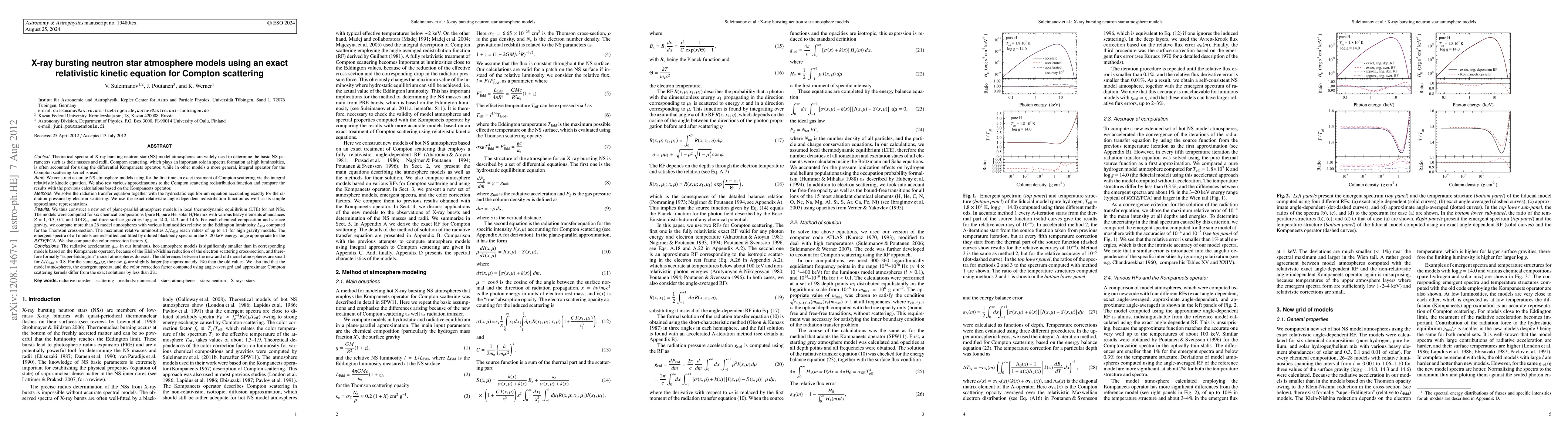 Theoretical spectra of X-ray bursting neutron star (NS) model atmospheres are widely used to determine the basic NS parameters such as their masses and radii. We construct accurate NS atmosphere models using for the first time an exact treatment of Compton scattering via the integral relativistic kinetic equation. We also compare the results with the previous calculations based on the Kompaneets operator. We solve the radiation transfer equation together with the hydrostatic equilibrium equation accounting exactly for the radiation pressure by electron scattering. We thus construct a new set of plane-parallel atmosphere models in LTE for hot NSs. The models were computed for six chemical compositions (pure H, pure He, solar H/He mix with various heavy elements abundances Z = 1, 0.3, 0.1, and 0.01 Z_sun, and three log g = 14.0, 14.3, and 14.6. For each chemical composition and log g, we compute more than 26 model atmospheres with various luminosities relative to the Eddington luminosity L_Edd computed for the Thomson cross-section. The maximum relative luminosities L/L_Edd reach values of up to 1.1 for high gravity models. The emergent spectra of all models are redshifted and fitted by diluted blackbody spectra in the 3--20 keV energy range appropriate for the RXTE/PCA. We also compute the color correction factors f_c. The radiative acceleration g_rad in our luminous, hot-atmosphere models is significantly smaller than in corresponding models based on the Kompaneets operator, because of the Klein-Nishina reduction of the electron scattering cross-section, and therefore formally "super-Eddington" model atmospheres do exist. The differences between the new and old model atmospheres are small for L / L_Edd < 0.8. For the same g_rad / g, the new f_c are slightly larger (by approximately 1%) than the old values.