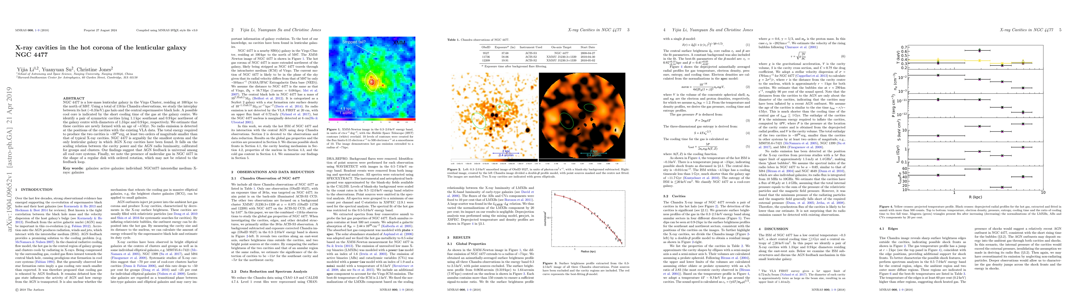 NGC 4477 is a low-mass lenticular galaxy in the Virgo Cluster, residing at 100\,kpc to the north of M87. Using a total of 116\,ks {\sl Chandra} observations, we study the interplay between its hot ($\sim$0.3\,keV) gas halo and the central supermassive black hole. A possible cool core is indicated by the short cooling time of the gas at the galaxy centre. We identify a pair of symmetric cavities lying 1.1\,kpc southeast and 0.9\,kpc northwest of the galaxy centre with diameters of 1.3\,kpc and 0.9\,kpc, respectively. We estimate that these cavities are newly formed with an age of $\sim$4\,Myr. No radio emission is detected at the positions of the cavities with the existing VLA data. The total energy required to produce the two cavities is $\sim$$10^{54}$\,erg, at least two orders of magnitude smaller than that of typical X-ray cavities. NGC 4477 is arguably far the smallest system and the only lenticular galaxy in which AGN X-ray cavities have been found. It falls on the scaling relation between the cavity power and the AGN radio luminosity, calibrated for groups and clusters. Our findings suggest that AGN feedback is universal among all cool core systems. Finally, we note the presence of molecular gas in NGC~4477 in the shape of a regular disk with ordered rotation, which may not be related to the feedback loop.