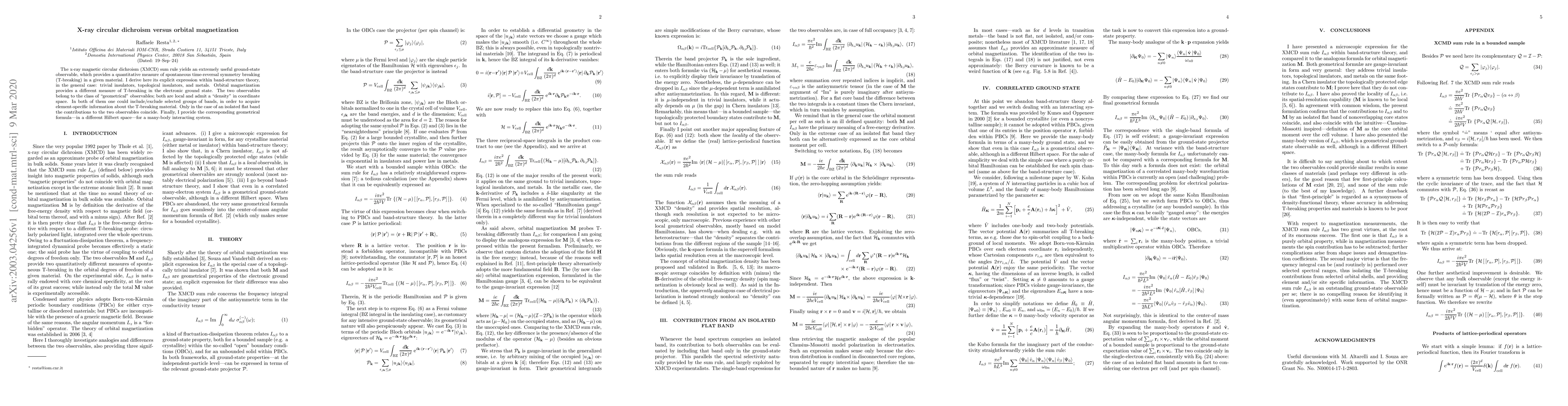 This research derives the explicit expression for the x-ray magnetic circular dichroism (XMCD) sum rule within band-structure theory, comparing it to orbital magnetization as measures of spontaneous time-reversal symmetry breaking in various materials. The study concludes that while both are "geometrical" observables, their contributions generally differ except in specific cases like isolated flat bands.