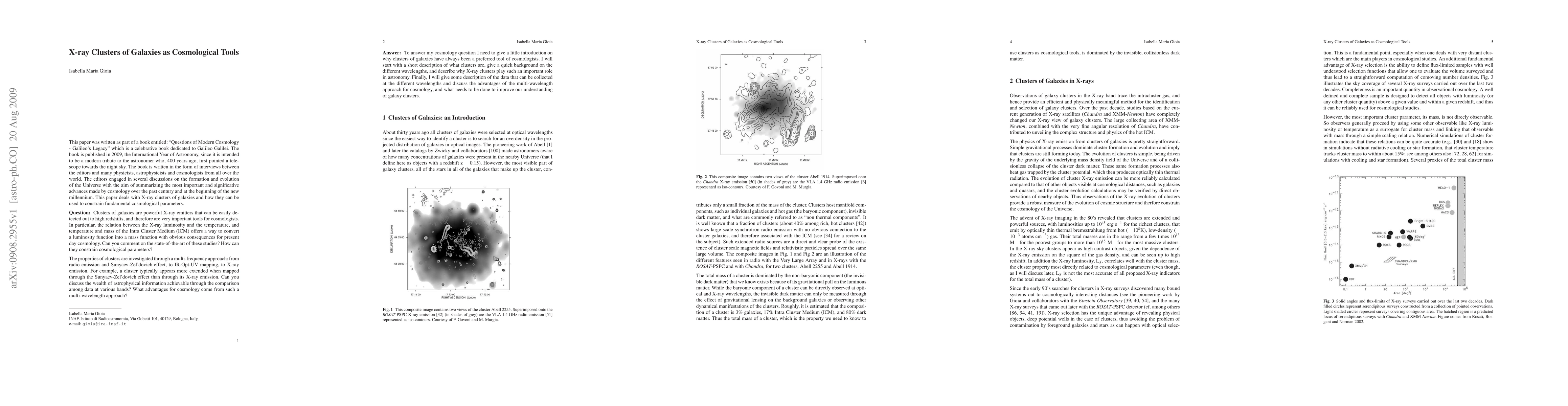 This paper was written as part of a book entitled: "Questions of Modern Cosmology - Galileo's Legacy" which is a celebrative book dedicated to Galileo Galilei. The book is published in 2009, the International Year of Astronomy, since it is intended to be a modern tribute to the astronomer who, 400 years ago, first pointed a telescope towards the night sky. The book is written in the form of interviews between the editors and many physicists, astrophysicists and cosmologists from all over the world. The editors engaged in several discussions on the formation and evolution of the Universe with the aim of summarizing the most important and significative advances made by cosmology over the past century and at the beginning of the new millennium. This paper deals with X-ray clusters of galaxies and how they can be used to constrain fundamental cosmological parameters.