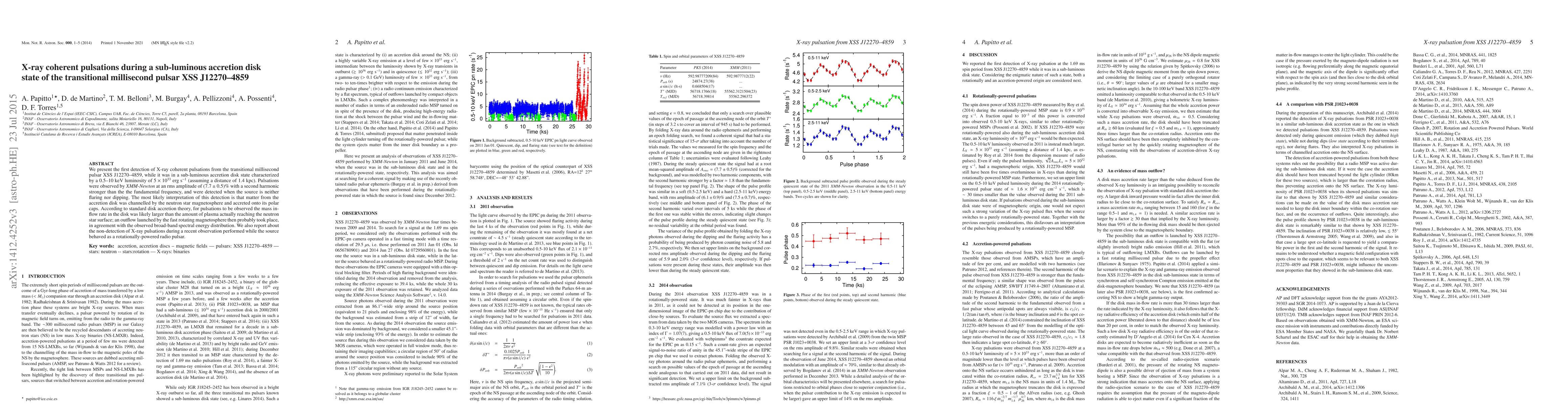 This paper reports the first detection of X-ray coherent pulsations from the transitional millisecond pulsar XSS J12270-4859 during a sub-luminous accretion disk state, suggesting matter channeled by the neutron star's magnetosphere accreted onto its polar caps. The non-detection of pulsations during its radio pulsar state indicates different accretion dynamics.