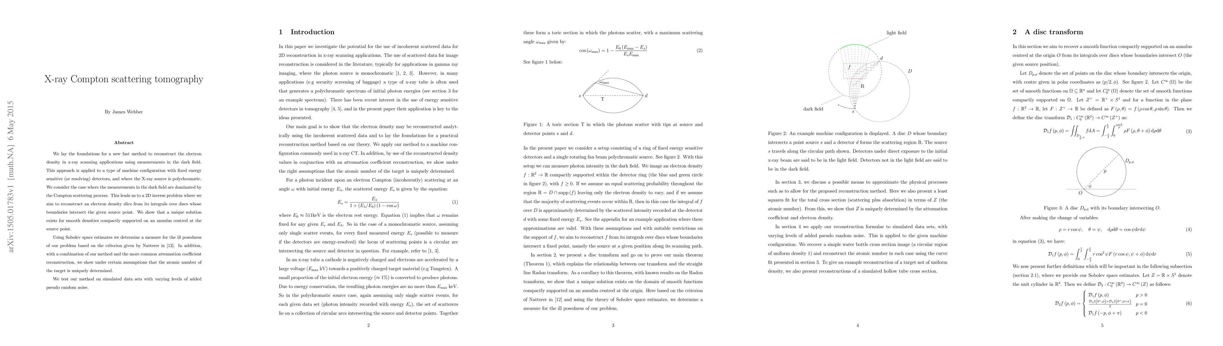 We lay the foundations for a new fast method to reconstruct the electron density in x-ray scanning applications using measurements in the dark field. This approach is applied to a type of machine configuration with fixed energy sensitive (or resolving) detectors, and where the X-ray source is polychromatic. We consider the case where the measurements in the dark field are dominated by the Compton scattering process. This leads us to a 2D inverse problem where we aim to reconstruct an electron density slice from its integrals over discs whose boundaries intersect the given source point. We show that a unique solution exists for smooth densities compactly supported on an annulus centred at the source point. Using Sobolev space estimates we determine a measure for the ill posedness of our problem based on the criterion given by Natterer ("The mathematics of computerized tomography" SIAM 2001). In addition, with a combination of our method and the more common attenuation coefficient reconstruction, we show under certain assumptions that the atomic number of the target is uniquely determined. We test our method on simulated data sets with varying levels of added pseudo random noise.