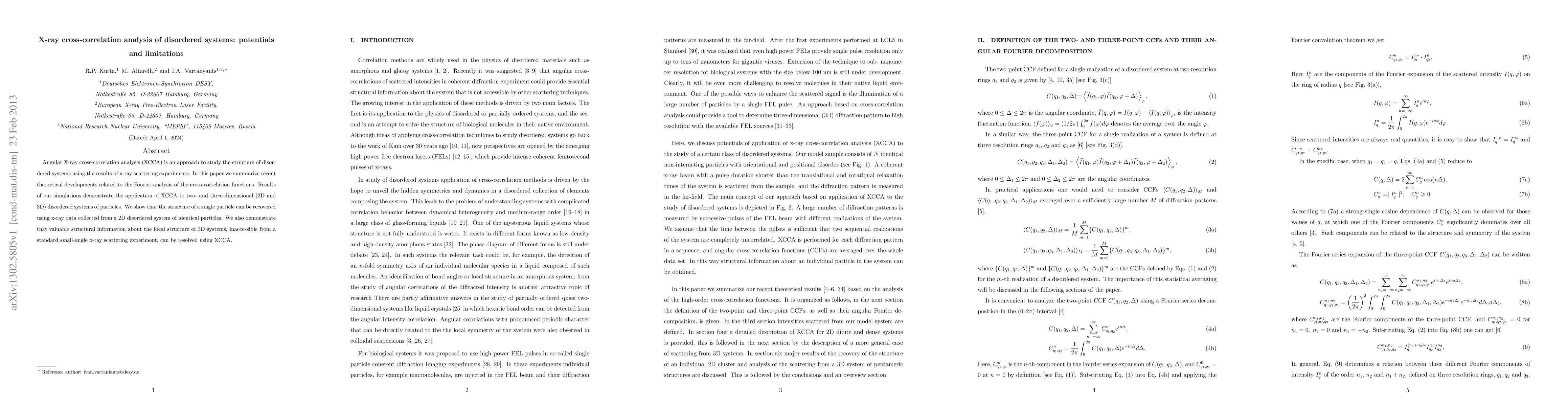 This paper discusses the theoretical advancements in angular x-ray cross-correlation analysis (XCCA) for studying disordered systems, demonstrating its ability to recover single particle structures from 2D systems and extract local structural information from 3D systems beyond standard small-angle x-ray scattering. The study highlights both the potentials and limitations of XCCA in structural analysis.