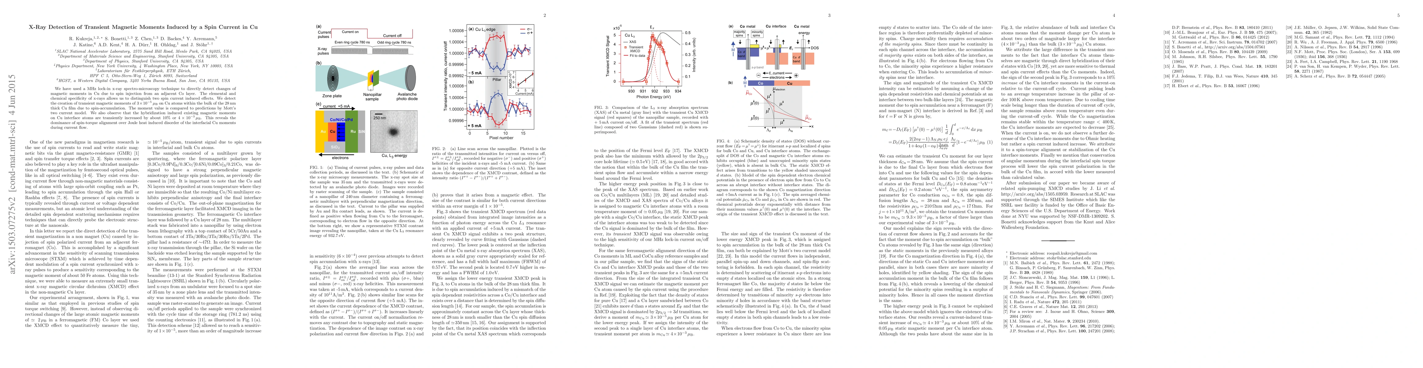We have used a MHz lock-in x-ray spectro-microscopy technique to directly detect changes of magnetic moments in Cu due to spin injection from an adjacent Co layer. The elemental and chemical specificity of x-rays allows us to distinguish two spin current induced effects. We detect the creation of transient magnetic moments of $3\times 10^{-5}$ $\mu_\mathrm{B}$ on Cu atoms within the bulk of the 28 nm thick Cu film due to spin-accumulation. The moment value is compared to predictions by Mott's two current model. We also observe that the hybridization induced existing magnetic moments on Cu interface atoms are transiently increased by about 10% or $4\times 10^{-3}$ $\mu_\mathrm{B}$. This reveals the dominance of spin-torque alignment over Joule heat induced disorder of the interfacial Cu moments during current flow.