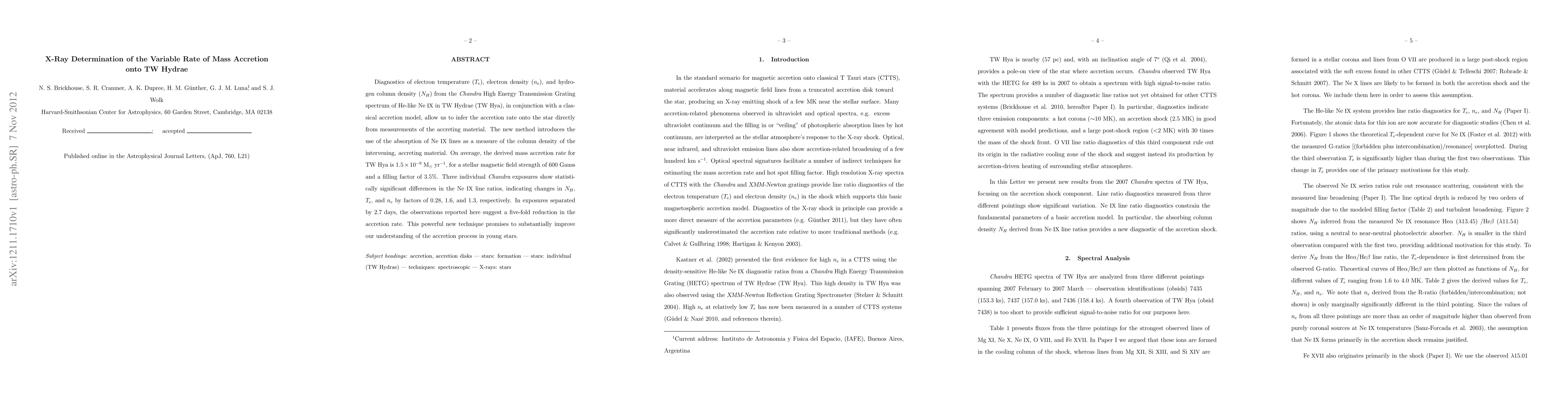 Diagnostics of electron temperature (T_e), electron density (n_e), and hydrogen column density (N_H) from the Chandra High Energy Transmission Grating spectrum of He-like Ne IX in TW Hydrae (TW Hya), in conjunction with a classical accretion model, allow us to infer the accretion rate onto the star directly from measurements of the accreting material. The new method introduces the use of the absorption of Ne IX lines as a measure of the column density of the intervening, accreting material. On average, the derived mass accretion rate for TW Hya is 1.5 x 10^{-9} M_{\odot} yr^{-1}, for a stellar magnetic field strength of 600 Gauss and a filling factor of 3.5%. Three individual Chandra exposures show statistically significant differences in the Ne IX line ratios, indicating changes in N_H, T_e, and n_e by factors of 0.28, 1.6, and 1.3, respectively. In exposures separated by 2.7 days, the observations reported here suggest a five-fold reduction in the accretion rate. This powerful new technique promises to substantially improve our understanding of the accretion process in young stars.