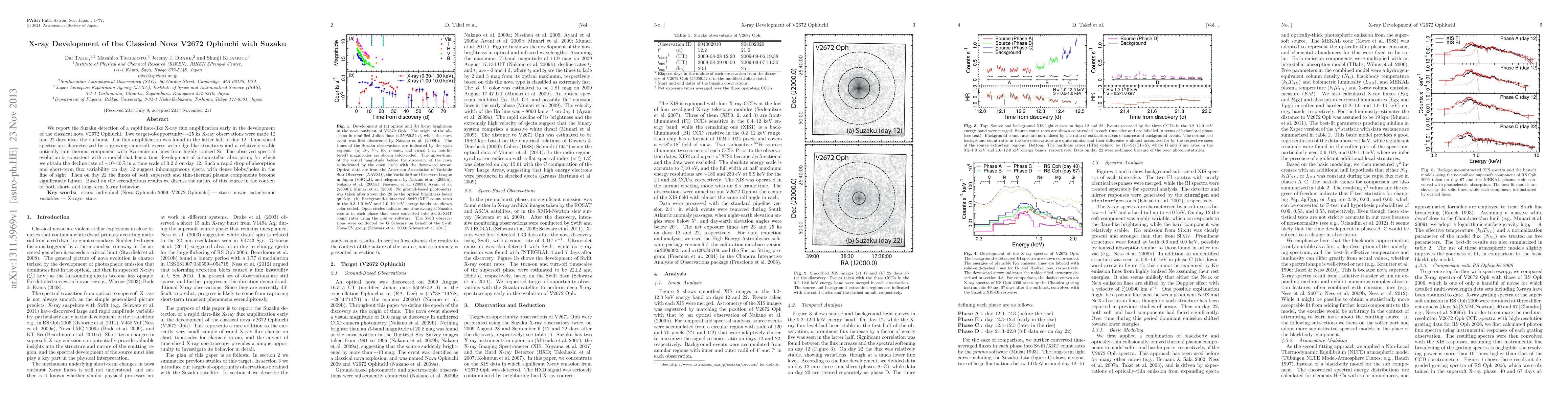 We report the Suzaku detection of a rapid flare-like X-ray flux amplification early in the development of the classical nova V2672 Ophiuchi. Two target-of-opportunity ~25 ks X-ray observations were made 12 and 22 days after the outburst. The flux amplification was found in the latter half of day 12. Time-sliced spectra are characterized by a growing supersoft excess with edge-like structures and a relatively stable optically-thin thermal component with Ka emission lines from highly ionized Si. The observed spectral evolution is consistent with a model that has a time development of circumstellar absorption, for which we obtain the decline rate of ~10-40 % in a time scale of 0.2 d on day 12. Such a rapid drop of absorption and short-term flux variability on day 12 suggest inhomogeneous ejecta with dense blobs/holes in the line of sight. Then on day 22 the fluxes of both supersoft and thin-thermal plasma components become significantly fainter. Based on the serendipitous results we discuss the nature of this source in the context of both short- and long-term X-ray behavior.