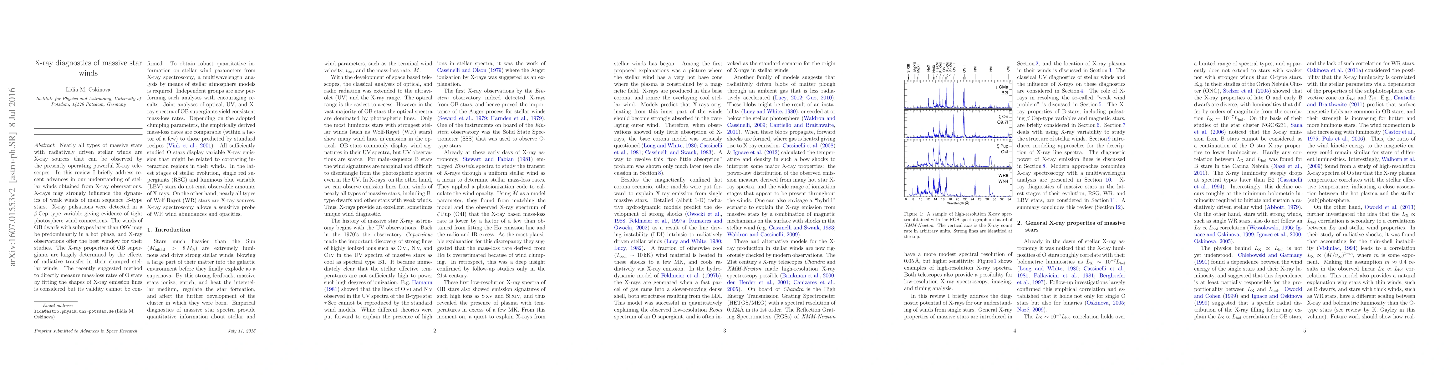 This paper reviews recent advances in understanding massive star winds through X-ray diagnostics, highlighting that X-ray observations are crucial for studying OB dwarfs and OB supergiants, while variable X-ray emissions in O stars suggest interactions in their winds. It emphasizes the need for multiwavelength analysis to obtain robust wind parameters and notes that Wolf-Rayet stars are prominent X-ray sources, allowing detailed study of their wind compositions.