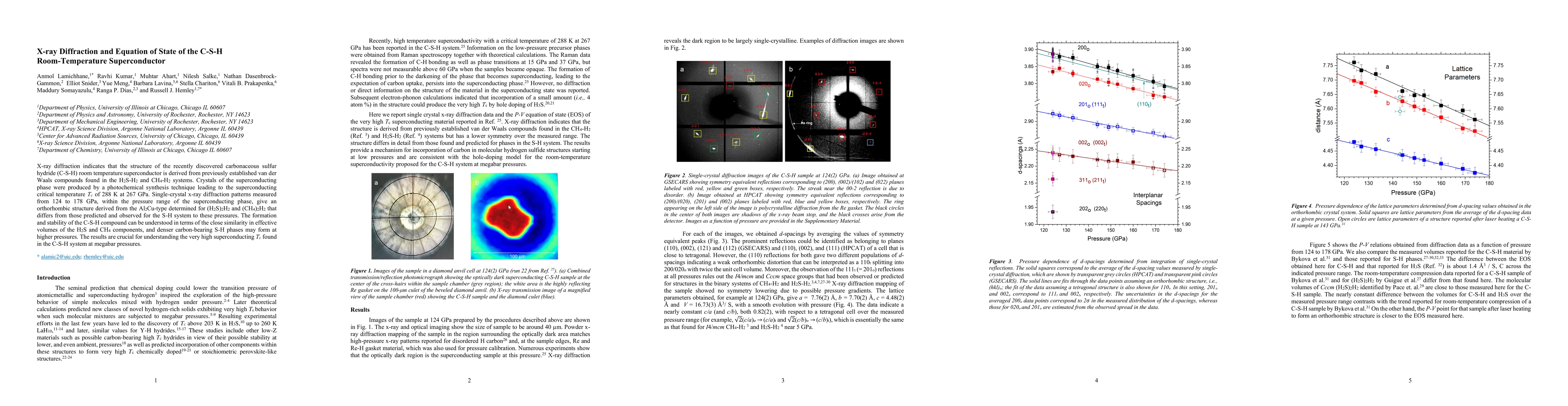 This paper reports on the x-ray diffraction structure of a newly discovered room-temperature superconductor, carbonaceous sulfur hydride (C-S-H), which is derived from van der Waals compounds in H$_2$S-H$_2$ and CH$_4$-H$_2$ systems. The study finds an orthorhombic structure and a critical temperature of 288 K at 267 GPa, suggesting hole-doping enhancement of superconductivity.