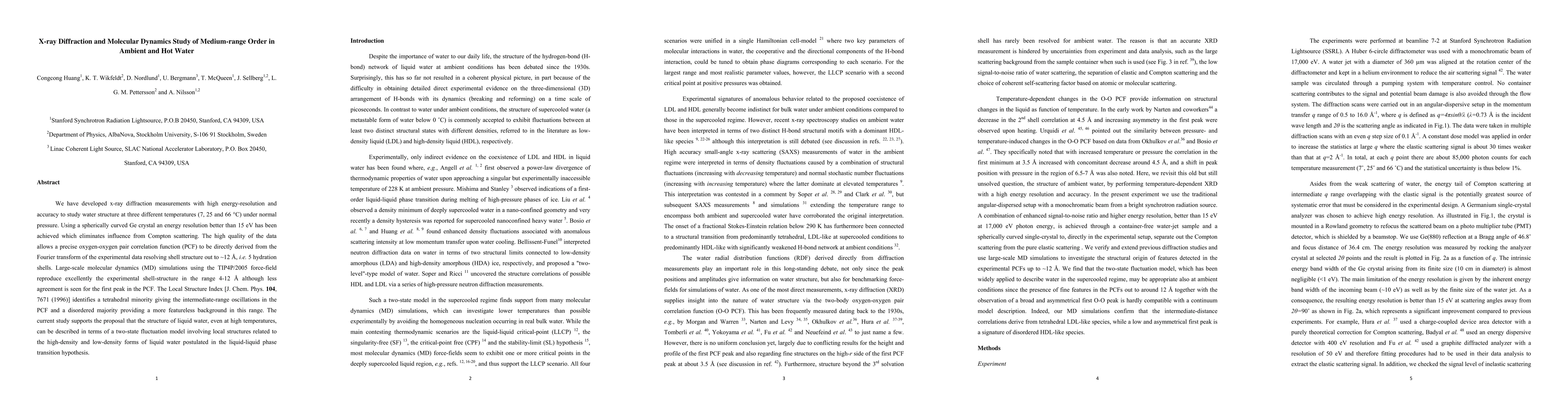 This study employs high-resolution x-ray diffraction to investigate the medium-range order in water at three temperatures, revealing detailed oxygen-oxygen pair correlation functions. Molecular dynamics simulations corroborate the experimental findings, supporting the two-state fluctuation model for liquid water structure.