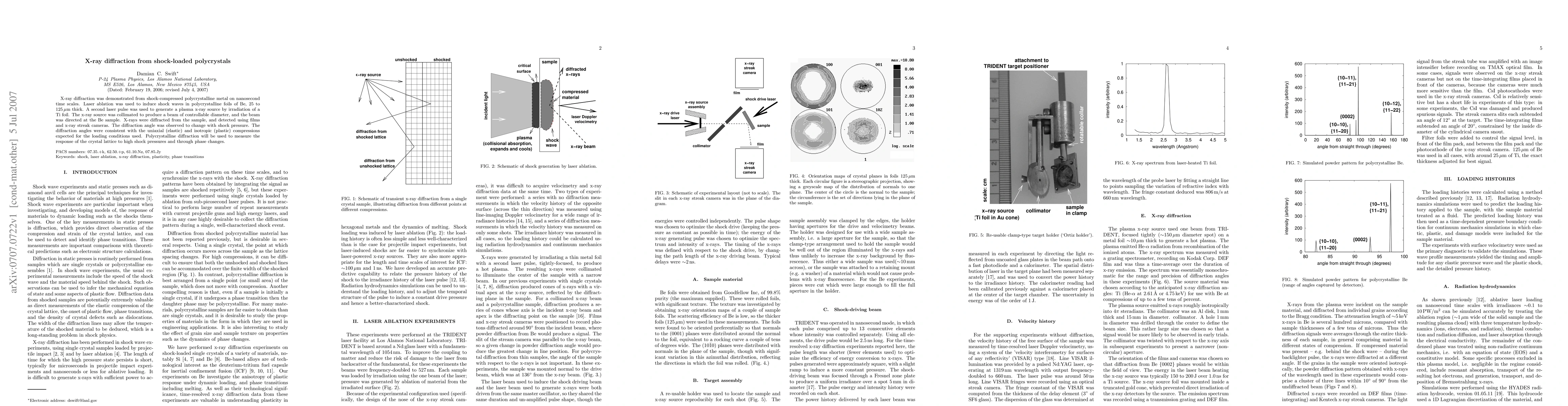 This study demonstrates x-ray diffraction from shock-compressed polycrystalline beryllium using nanosecond laser-induced shock waves, revealing changes in diffraction angles corresponding to elastic and plastic compressions. The technique aims to measure crystal lattice responses under high shock pressures and phase transitions.