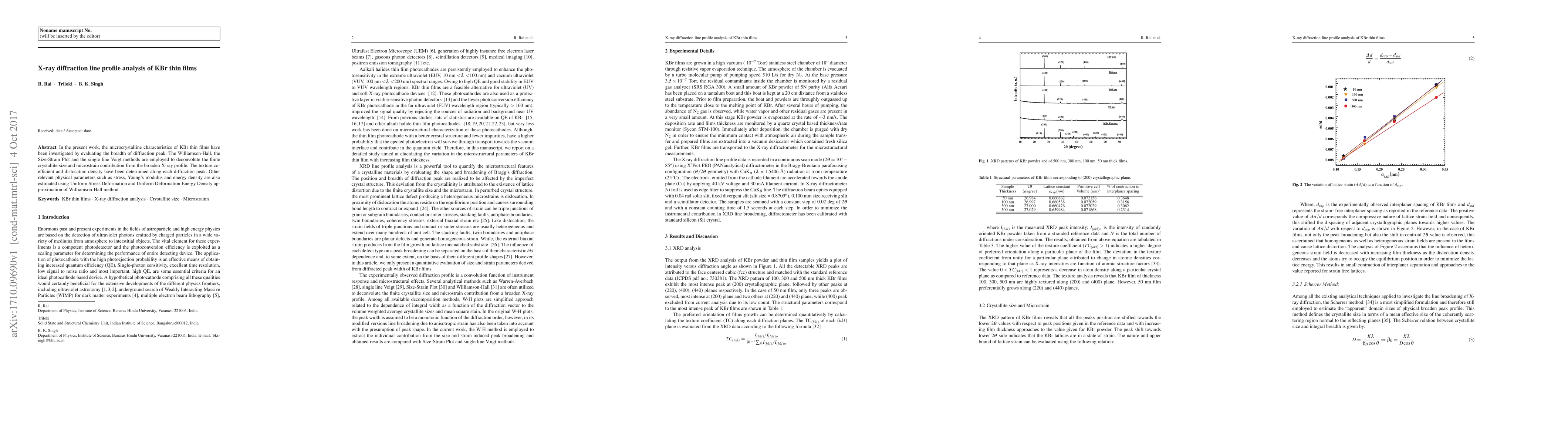 This study investigates the microcrystalline characteristics of KBr thin films using X-ray diffraction line profile analysis, employing the Williamson-Hall, Size-Strain Plot, and Voigt methods to determine crystallite size, microstrain, texture coefficient, dislocation density, and other physical parameters like stress and Young's modulus.