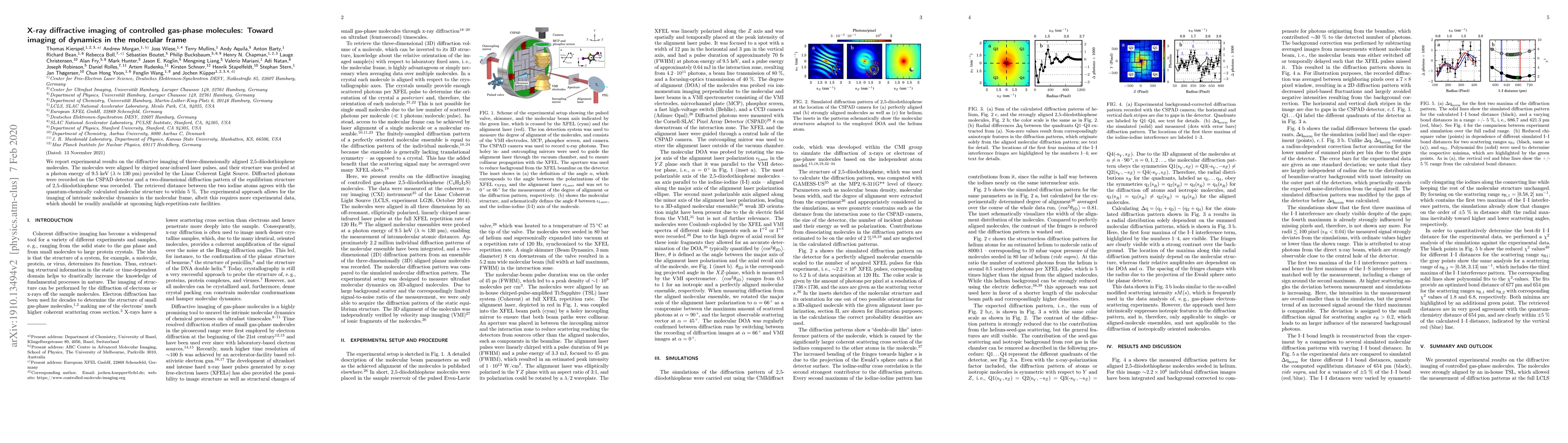 This paper presents an experimental method for diffractive imaging of aligned gas-phase molecules using X-rays, demonstrating the technique on 2,5-diiodothiophene molecules. The approach promises to visualize intrinsic molecular dynamics in the molecular frame, though further data collection is needed for full implementation.