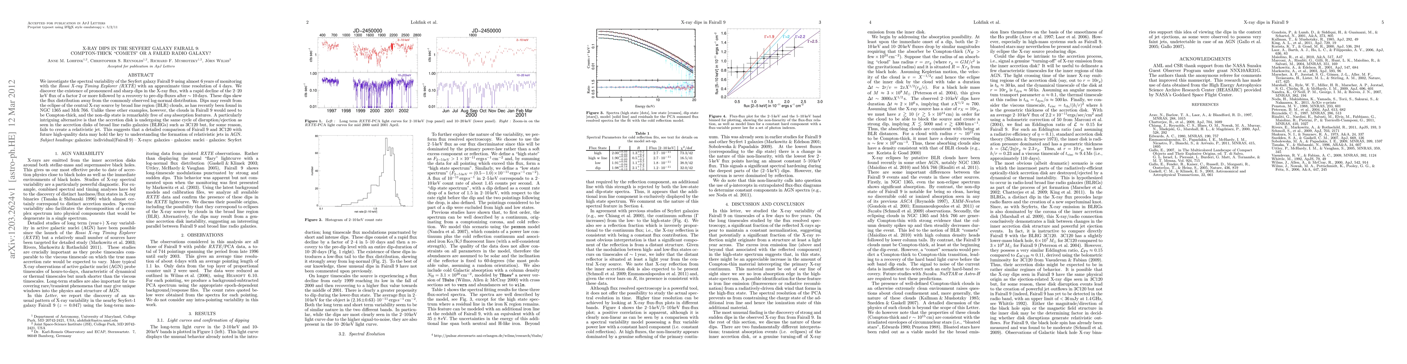 We investigate the spectral variability of the Seyfert galaxy Fairall 9 using almost 6 years of monitoring with the Rossi X-ray Timing Explorer (RXTE) with an approximate time resolution of 4 days. We discover the existence of pronounced and sharp dips in the X-ray flux, with a rapid decline of the 2--20 keV flux of a factor 2 or more followed by a recovery to pre-dip fluxes after ~10 days . These dips skew the flux distribution away from the commonly observed log-normal distribution. Dips may result from the eclipse of the central X-ray source by broad line region (BLR) clouds, as has recently been found in NGC 1365 and Mrk 766. Unlike these other examples, however, the clouds in Fairall 9 would need to be Compton-thick, and the non-dip state is remarkably free of any absorption features. A particularly intriguing alternative is that the accretion disk is undergoing the same cycle of disruption/ejection as seen in the accretion disks of broad line radio galaxies (BLRGs) such as 3C120 but, for some reason, fails to create a relativistic jet. This suggests that a detailed comparison of Fairall 9 and 3C120 with future high-quality data may hold the key to understanding the formation of relativistic jets in AGN.