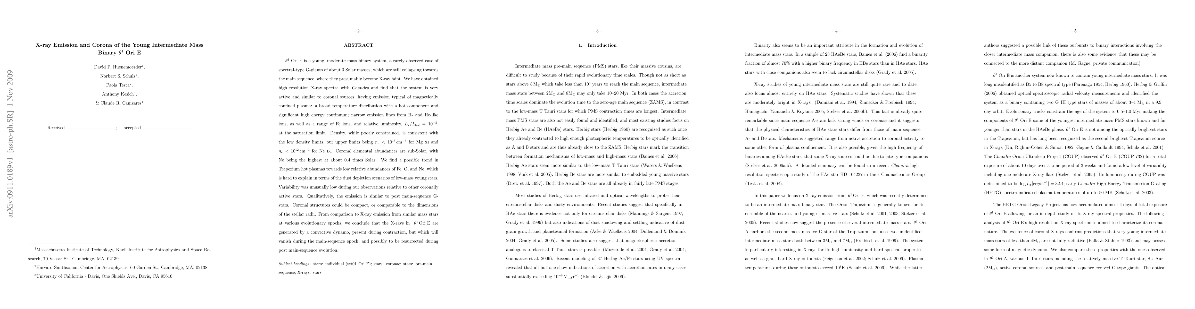 This paper investigates the X-ray emission from the young intermediate mass binary system $\theta^1$ Ori E, revealing it to be highly active and coronal-like with a broad temperature distribution and significant high-energy continuum. The study finds sub-Solar coronal elemental abundances and low variability, suggesting X-rays are generated by a convective dynamo.