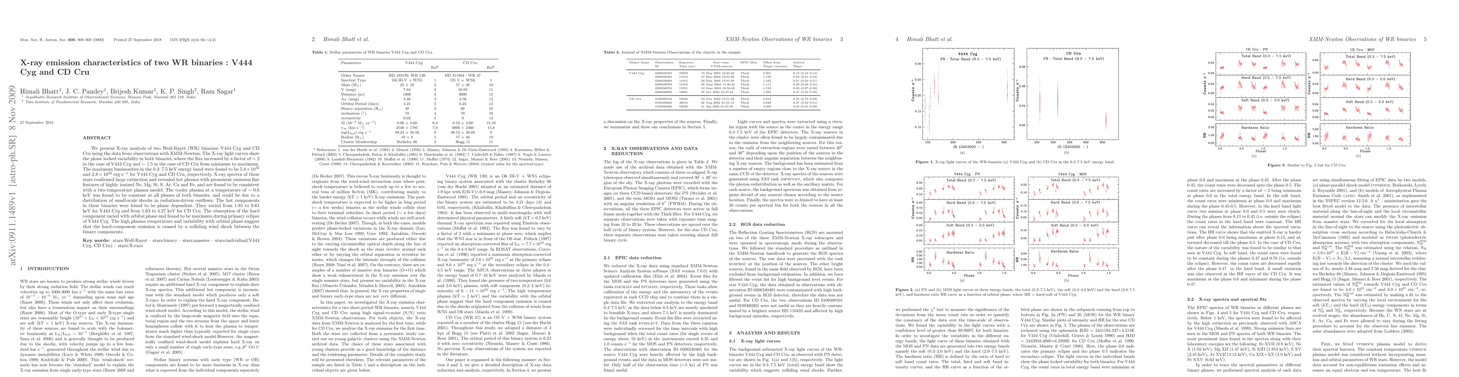This paper analyzes X-ray emissions from two Wolf-Rayet binaries, V444 Cyg and CD Cru, revealing phase-locked variability and significant flux increases. The study finds evidence of a two-temperature plasma model, with a constant cooler plasma and phase-dependent hotter plasma, suggesting colliding wind shocks between the binary components.