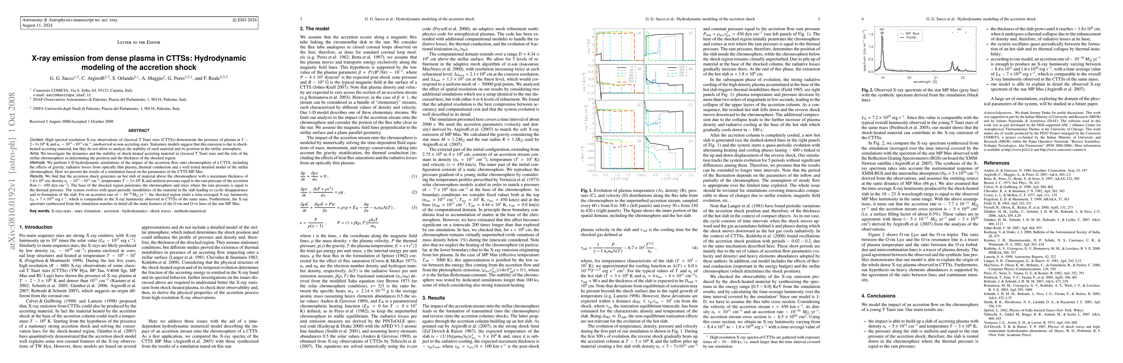 This paper investigates the hydrodynamics of accretion shocks in young stellar objects (CTTSs) using 1-D HD simulations. The study finds that the accretion shock generates a hot slab above the chromosphere, with a stable but periodically unstable structure, emitting X-rays comparable to observed luminosities. The simulation matches the observed X-ray spectral lines of the CTTS MP Mus.