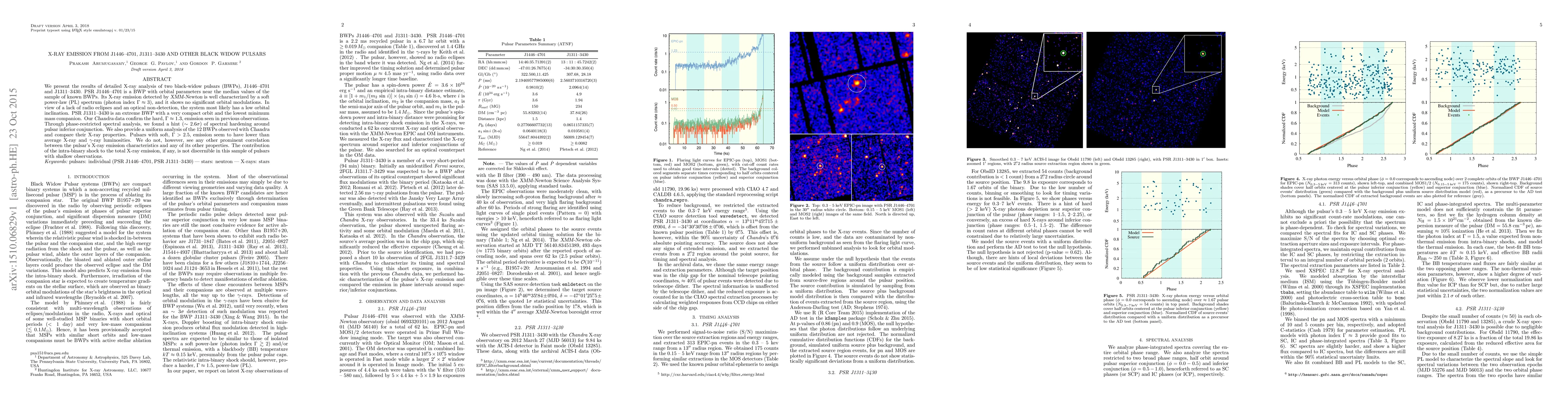This paper analyzes X-ray emissions from two black widow pulsars, J1446-4701 and J1311-3430, revealing a soft power-law spectrum for the former and a hint of spectral hardening for the latter around pulsar inferior conjunction. It also compares these findings with 12 other black widow pulsars, noting no clear correlation between X-ray emission characteristics and other pulsar properties.