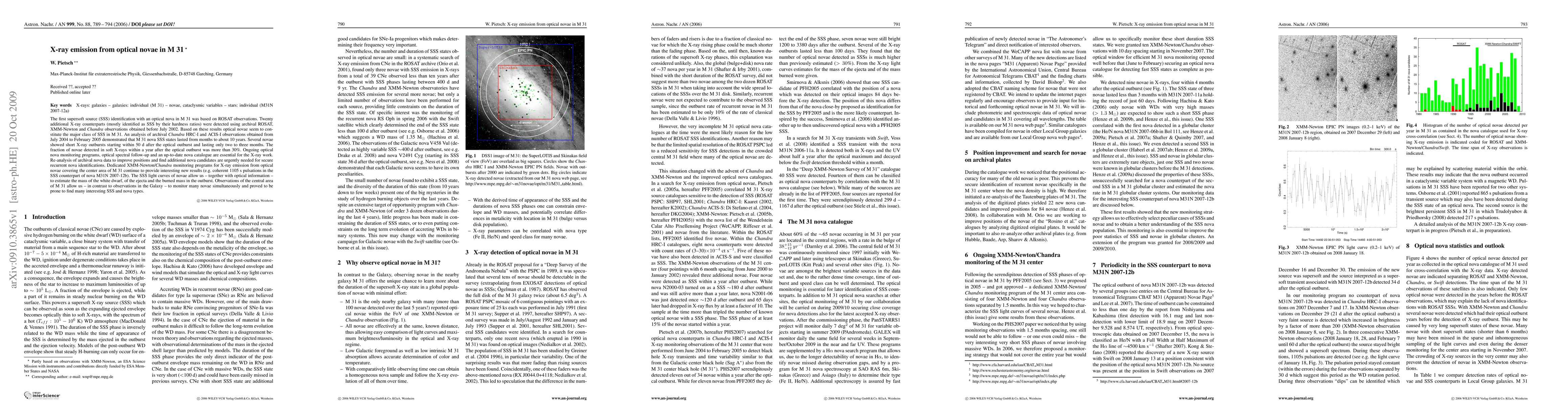 The first supersoft source (SSS) identification with an optical nova in M 31 was based on ROSAT observations. Twenty additional X-ray counterparts (mostly identified as SSS by their hardness ratios) were detected using archival ROSAT, XMM-Newton and Chandra observations obtained before July 2002. Based on these results optical novae seem to constitute the major class of SSS in M 31. An analysis of archival Chandra HRC-I and ACIS-I observations obtained from July 2004 to February 2005 demonstrated that M 31 nova SSS states lasted from months to about 10 years. Several novae showed short X-ray outbursts starting within 50 d after the optical outburst and lasting only two to three months. The fraction of novae detected in soft X-rays within a year after the optical outburst was more than 30%. Ongoing optical nova monitoring programs, optical spectral follow-up and an up-to-date nova catalogue are essential for the X-ray work. Re-analysis of archival nova data to improve positions and find additional nova candidates are urgently needed for secure recurrent nova identifications. Dedicated XMM-Newton/Chandra monitoring programs for X-ray emission from optical novae covering the center area of M 31 continue to provide interesting new results (e.g. coherent 1105s pulsations in the SSS counterpart of nova M31N 2007-12b). The SSS light curves of novae allow us - together with optical information - to estimate the mass of the white dwarf, of the ejecta and the burned mass in the outburst. Observations of the central area of M 31 allow us - in contrast to observations in the Galaxy - to monitor many novae simultaneously and proved to be prone to find many interesting SSS and nova types.