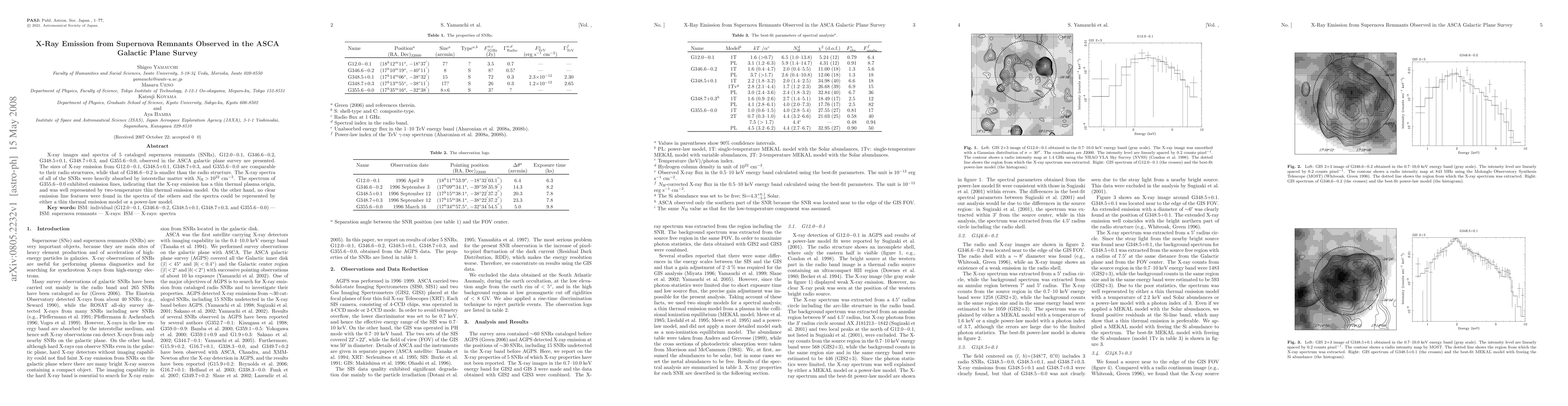 X-ray images and spectra of 5 cataloged supernova remnants (SNRs), G12.0-0.1, G346.6-0.2, G348.5+0.1, G348.7+0.3, and G355.6-0.0, observed in the ASCA galactic plane survey are presented. The sizes of X-ray emission from G12.0-0.1, G348.5+0.1, G348.7+0.3, and G355.6-0.0 are comparable to their radio structures, while that of G346.6-0.2 is smaller than the radio structure. The X-ray spectra of all of the SNRs were heavily absorbed by interstellar matter with N_H>10^{22} cm^{-2}. The spectrum of G355.6-0.0 exhibited emission lines, indicating that the X-ray emission has a thin thermal plasma origin, and was well represented by two-temperature thin thermal emission model. On the other hand, no clear emission line features were found in the spectra of the others and the spectra could be represented by either a thin thermal emission model or a power-law model.