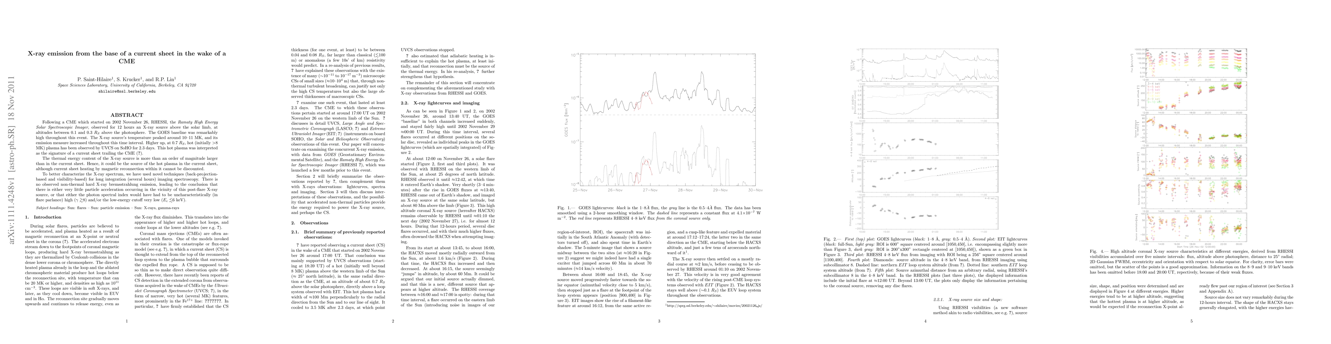 This study investigates X-ray emissions from the base of a current sheet following a 2002 CME, revealing a significant thermal energy source at 0.1-0.3 RS above the photosphere with peak temperatures around 10-11 MK. No non-thermal hard X-ray emission was detected, suggesting minimal particle acceleration or an unusually high photon spectral index.