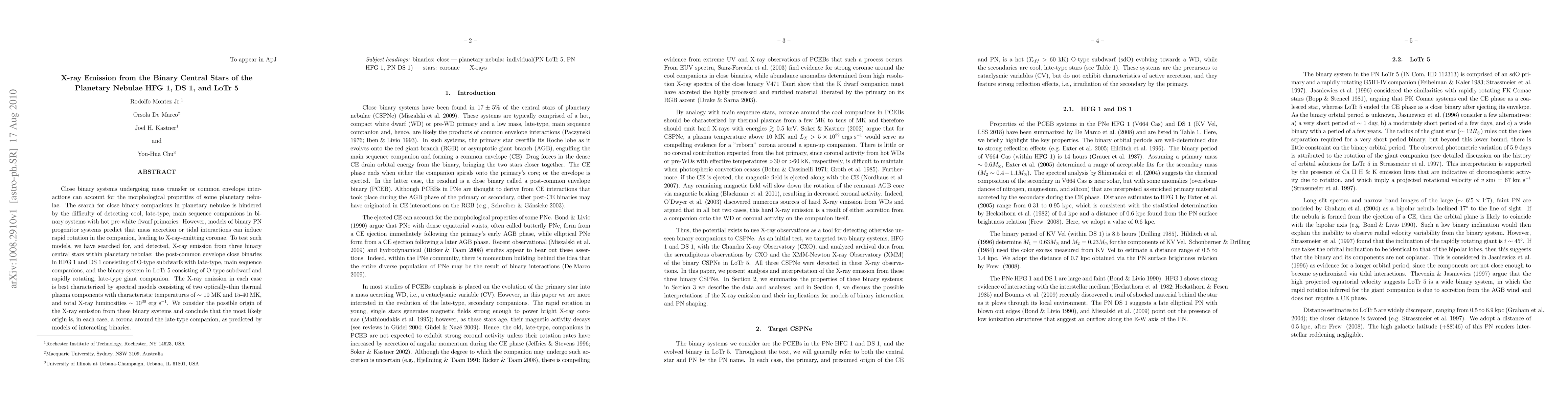 The research paper reports detection of X-ray emission from three binary central stars in planetary nebulae HFG 1, DS 1, and LoTr 5. These X-rays, characterized by two hot thermal plasma components, suggest the presence of coronas around late-type companions, supporting models of interacting binaries.