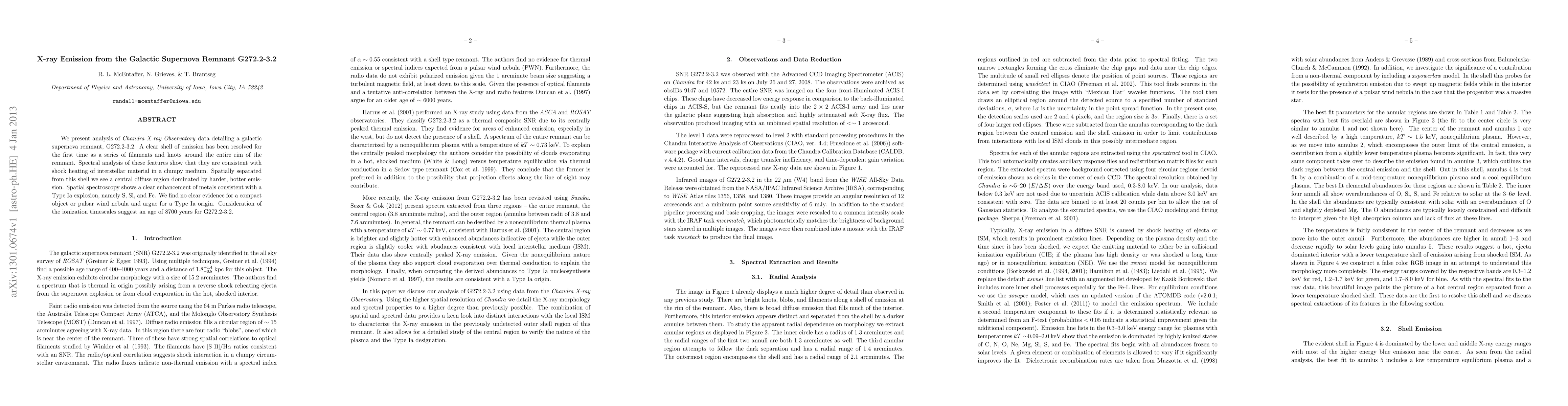 This study analyzes Chandra X-ray data of the supernova remnant G272.2-3.2, revealing a shell of emission consistent with shock-heated interstellar material, and a central region with hotter, harder emission. Spectral evidence suggests a Type Ia supernova origin, with an estimated age of 8700 years.