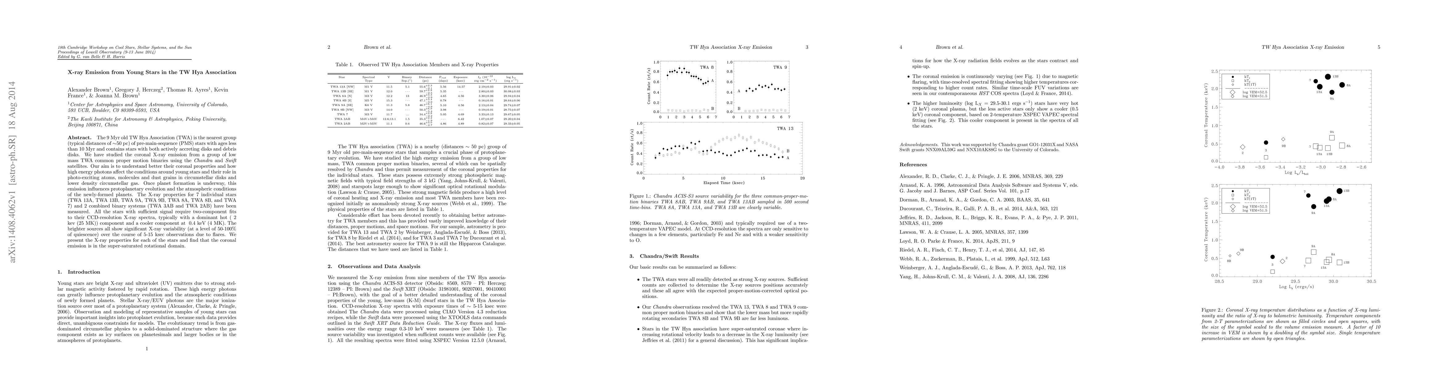 This study investigates the X-ray emission from young stars in the TW Hya Association using {\it{Chandra}} and {\it{Swift}} satellites, revealing two-component coronal spectra and significant variability due to flares. The findings suggest a super-saturated rotational domain affecting circumstellar disks and influencing protoplanetary evolution.